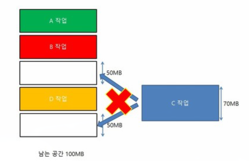 외부단편화는 메모리 할당과 해제가 반복되면서 위 그림처럼 중간중간 빈 공간이 생깁니다. 저렇게 빈 공간을 다 합치면 충분한 공간이 있지만, 한 공간단 크기가 작아 메모리가 더 이상 할당되지 못하는 현상이 바로 외부 단편화입니다.
