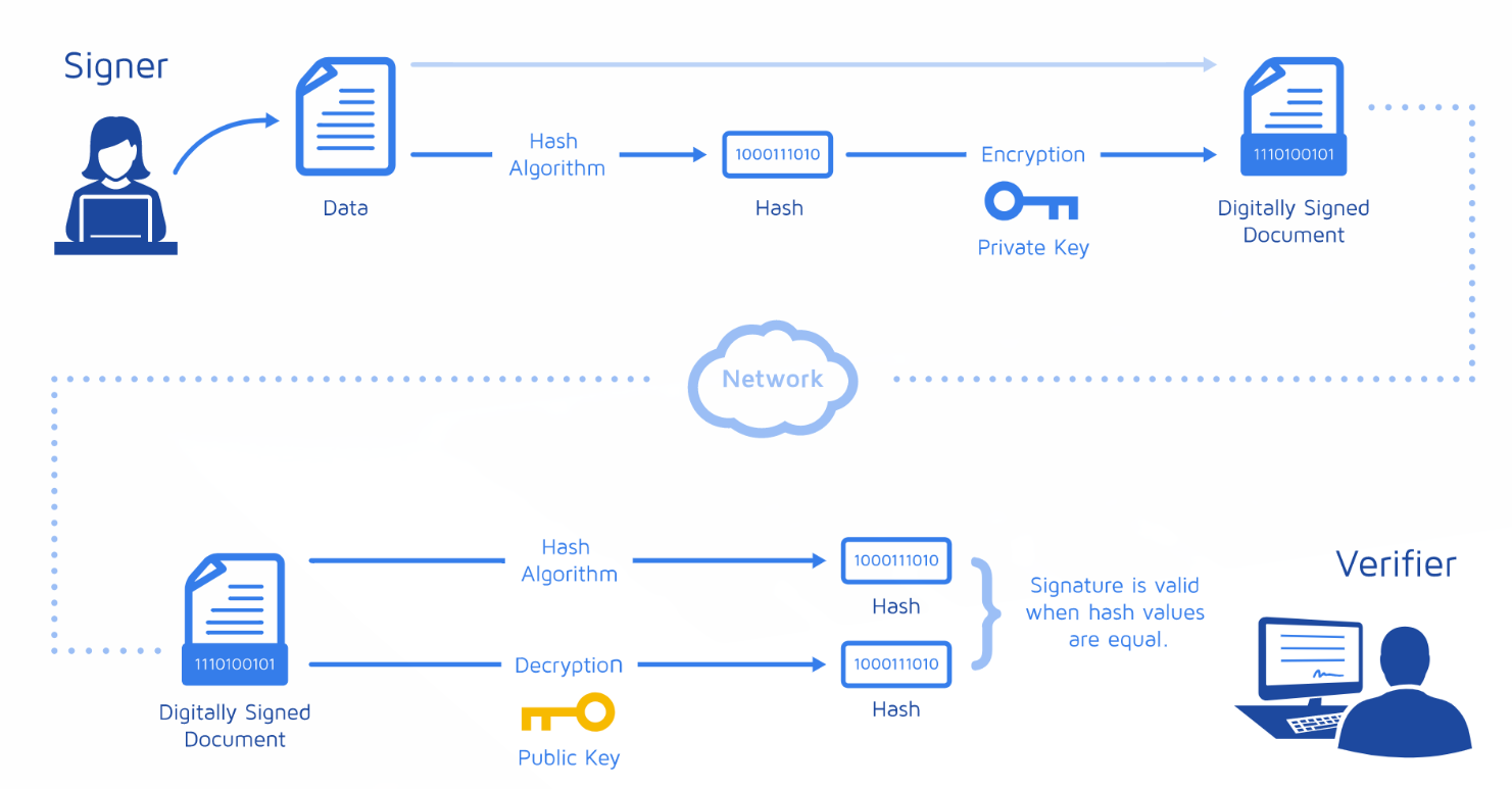 예를 들어 바이러스같은걸 암호화해서 배포해서 복호화하여 사용하면… 이게 제작자가 배포한 건지 제삼자가 뿌린 건지 모르게 됩니다. 즉, 공개키 방식은 암호화뿐 아니라 데이터 제공자의 신분도 보장해주는 것입니다. 공개키를 이용해 복호화했다는 것은 제작자만 가지고 있는 개인키로 암호화를 했다는 것이니까 말이죠.