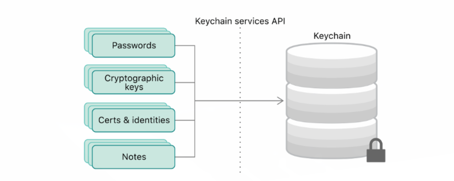 여러 정보들이 저장되는 키체인은 하나의 암호화된 컨테이너입니다. 이러한 컨테이너에 저장된 정보를 암호화하고 복호화해서 안전하게 사용할 수 있도록 Keychain services API를 제공합니다. 해당 API를 사용하는 방법에는 다양한 게 있지만 가장 간단한 것은 KeychainItemWrapper class를 이용하는 게 아닐까 합니다.
