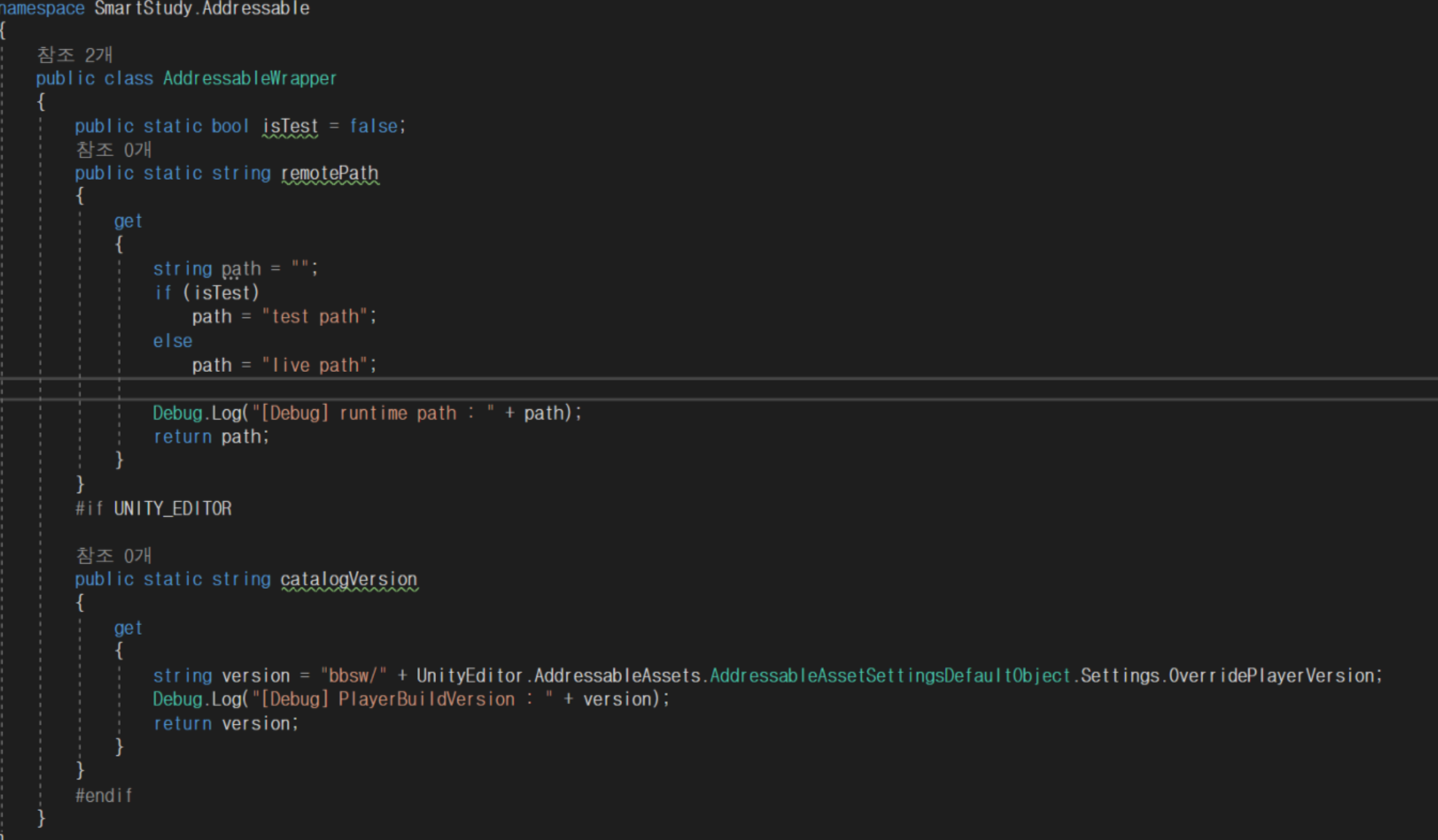 {…} 안에 들어갈 내용은 특정 class의 static string 값입니다. 즉, 내용을 살펴 본다면 “SmartStudy.Addressable namespace의 AddressableWrapper 라는 class의 remotePath 라는 static string 변수를 런타임에 사용한다”라는 뜻입니다. 앱의 런타임에 isTest 값에 따라 서로 다른 값을 return해주는 remotePath 변수에 각 환경에 맞는 저장소 path를 넣어줌으로써 스테이지 스위칭을 구현했습니다.