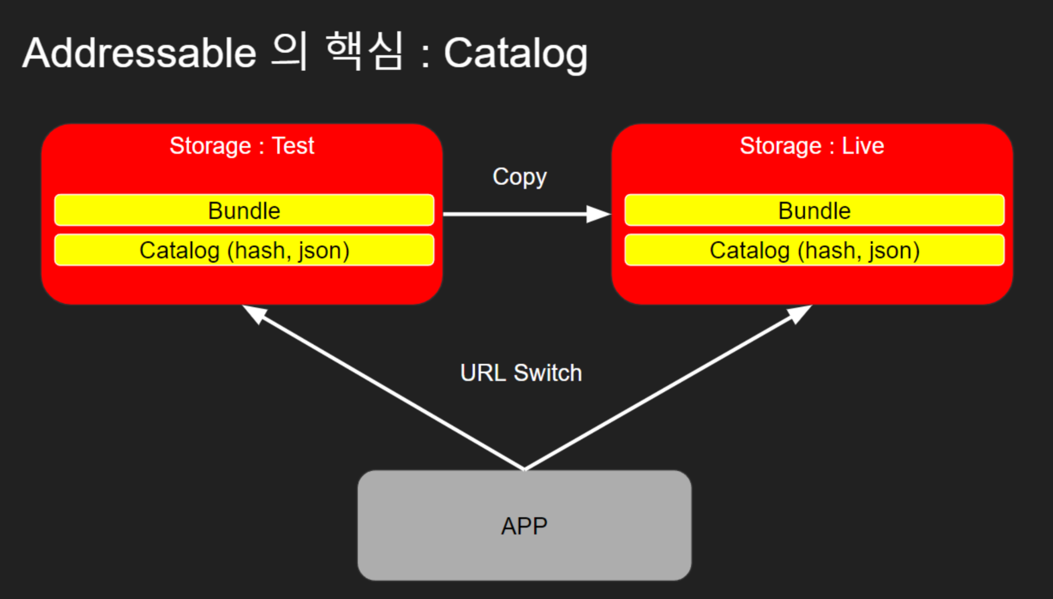 특정 방법으로 테스트/프로덕션 상황을 알 수 있다면, 저장소 위치 스위칭은 어떻게 해주지? 라는 고민을 하게 되었습니다. 프로젝트를 별도로 관리해 Addressable asset profile을 따로 나눠주나? 이는 너무 비효율적입니다. 프로젝트간 profile 간 Sync를 맞춰 주는게 휴먼 미스 등의 위험 요소도 많았고, 자동화 작업을 추가하는 것도 효율이 좋지 않았기 때문입니다. 또한 기존에 테스트/프로덕션 인식 기술은 하나의 앱의 런타임 환경에서 확인할 수 있는 구조이기 때문에 함께 맞춰줄 필요도 있었습니다.