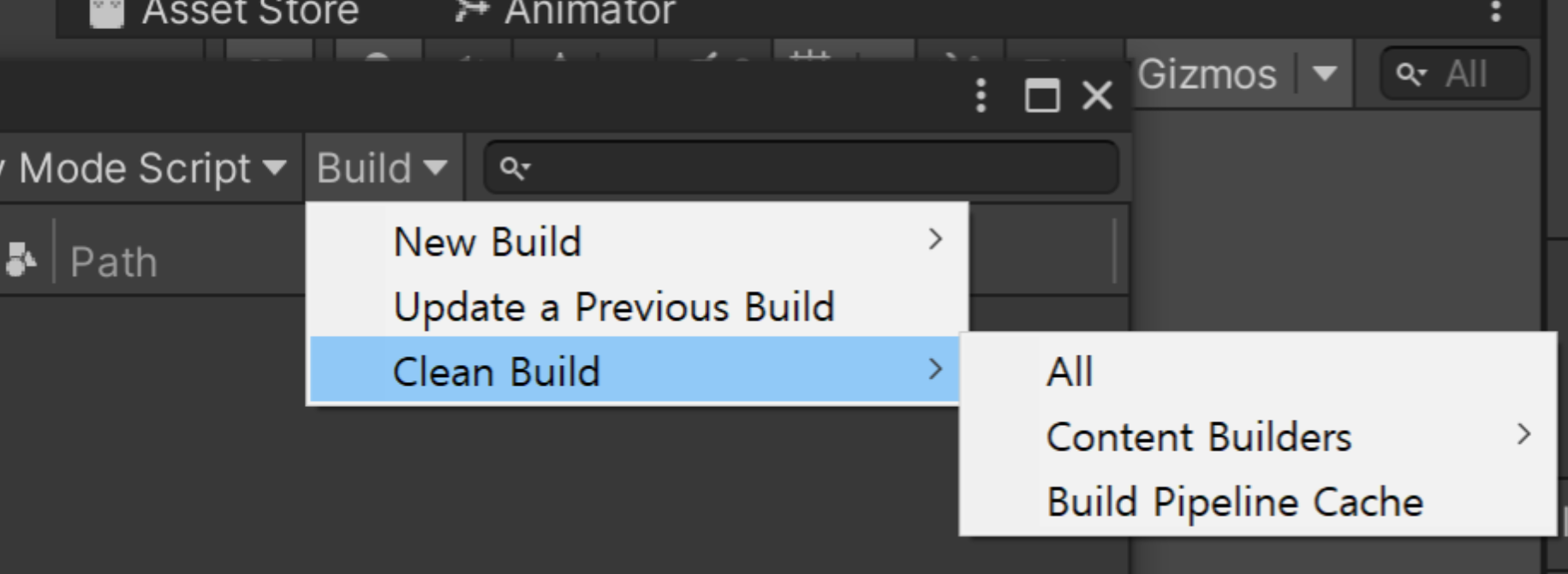 빌드 준비가 되었다면, Clean Build를 원할 경우 Build 메뉴의 Clean Build를 실행해주시면 됩니다. 해당 기능을 수행할 경우, 번들 빌드가 진행되어야 Addressable asset bundle을 이용할 수 있습니다. 번들과 관련된 모든 캐시를 지워주는 기능입니다.