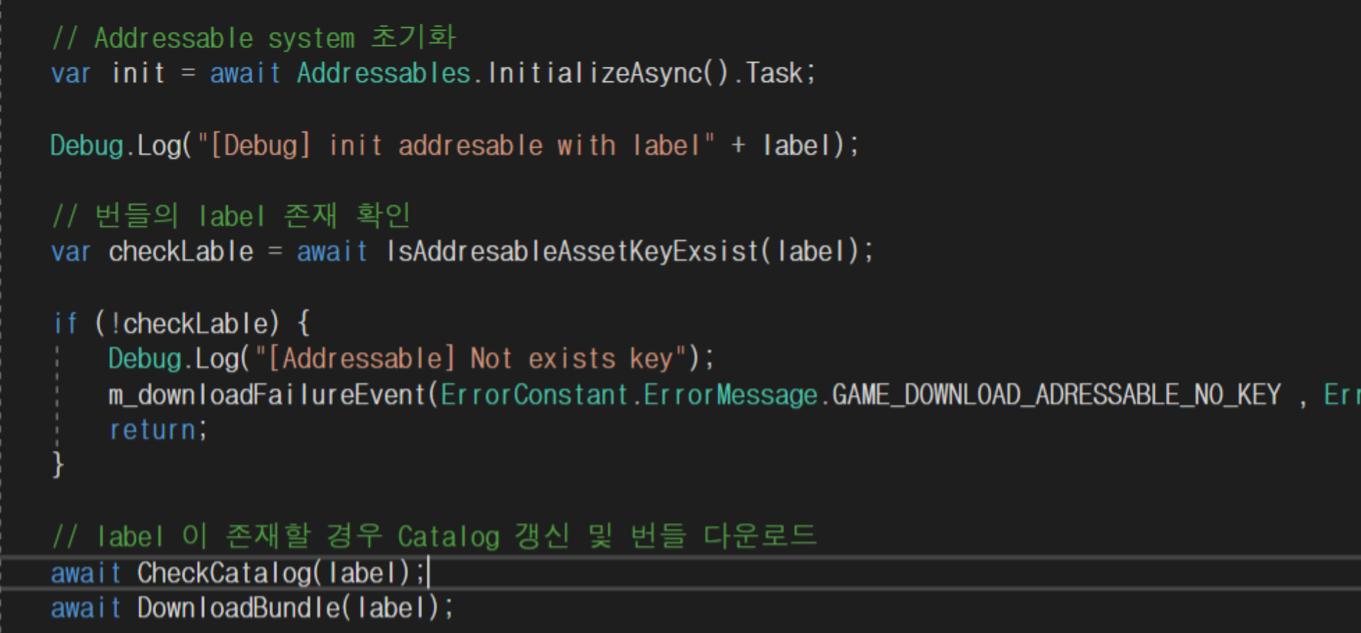 2. 프로젝트에서 Addressable api 초기화 및 번들 다운로드