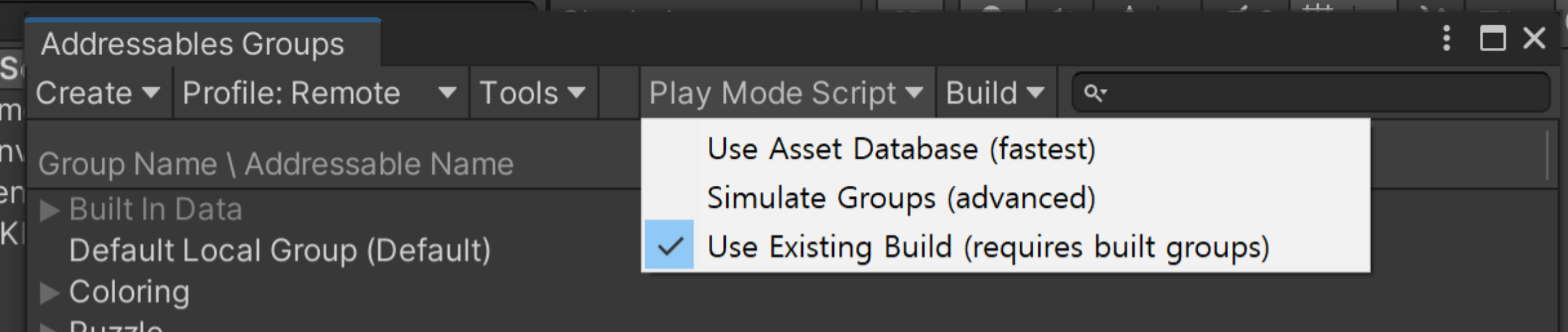 - Use Existing Build (requires built groups): 실제로 번들을 빌드하고, 번들에 기재된 프로필의 경로에서 Load하여 사용하는 설정 입니다. 즉, 해당 설정으로 세팅해주셔야 에디터에서도 원격에 저장된 번들을 확인할 수 있습니다.