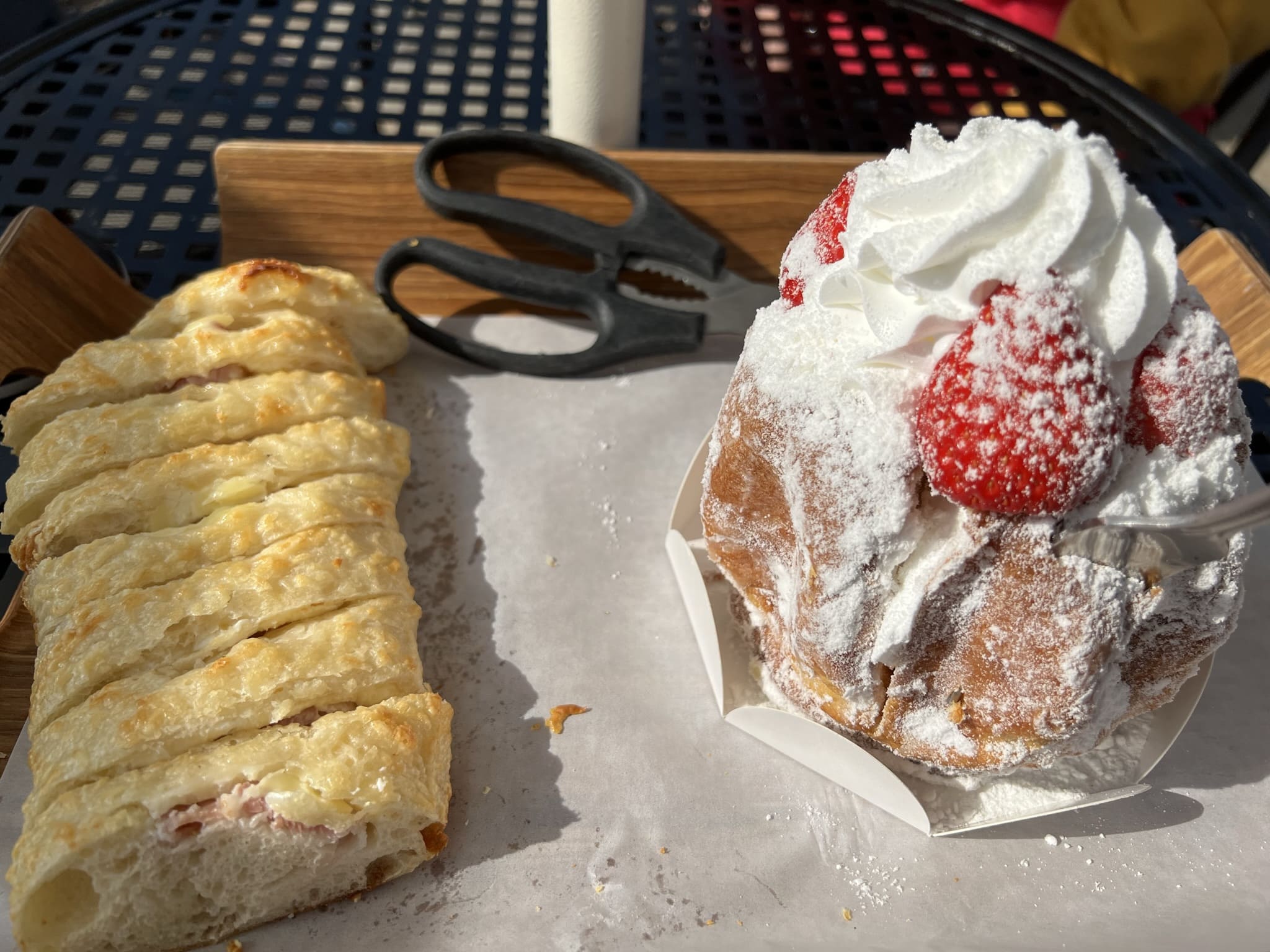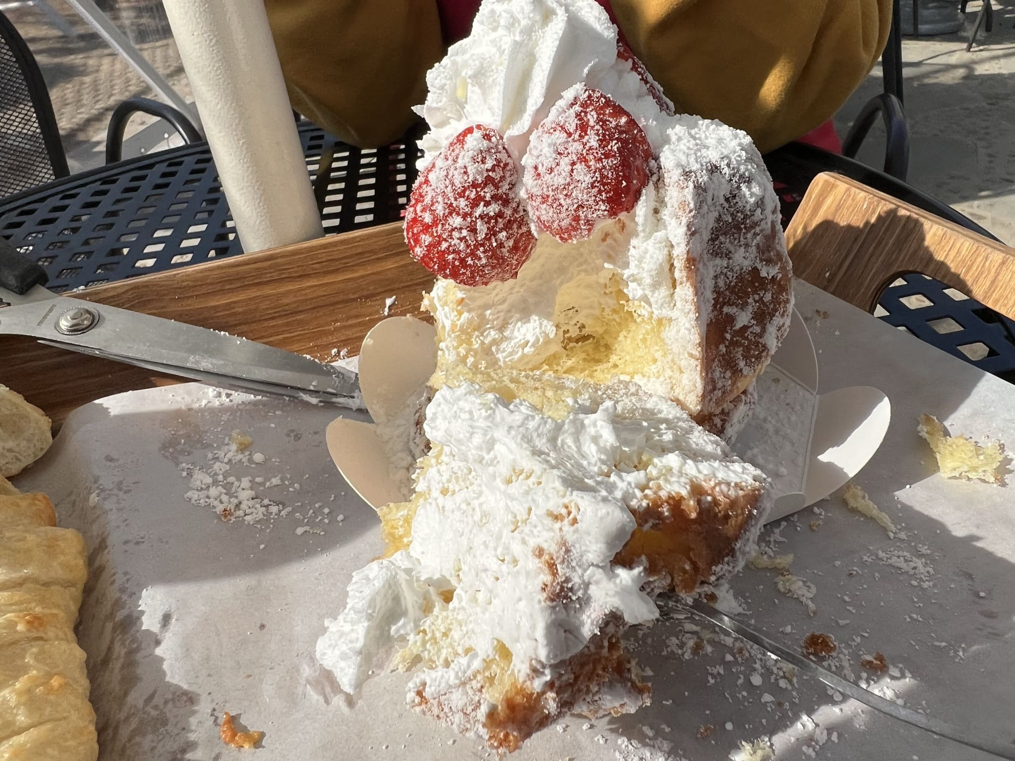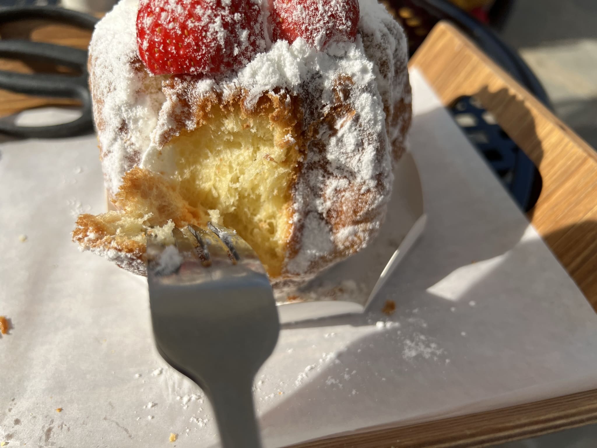 이탈리아 베로나 지방의 대표적인 크리스마스 케익이라고 하네요. 크리스마스는 아니지만 맛있어 보이기에 일단 먹어보았습니다. 확실히 크리스마스트리를 연상시키는 비주얼이네요. 처음에 겉쪽을 뜯었을 때는 그냥 살짝 감칠맛 나는 빵 반죽인가 생각했고 그 위에 생크림과 딸기를 얹은 건 줄 알았지만... 조금 더 뜯어보니 빵 안쪽에 생크림을 가득 채워 넣고 위쪽에 삐져나온 것이더라고요. 위에 올라간 딸기도 은근히 달달하고 맛있었습니다.