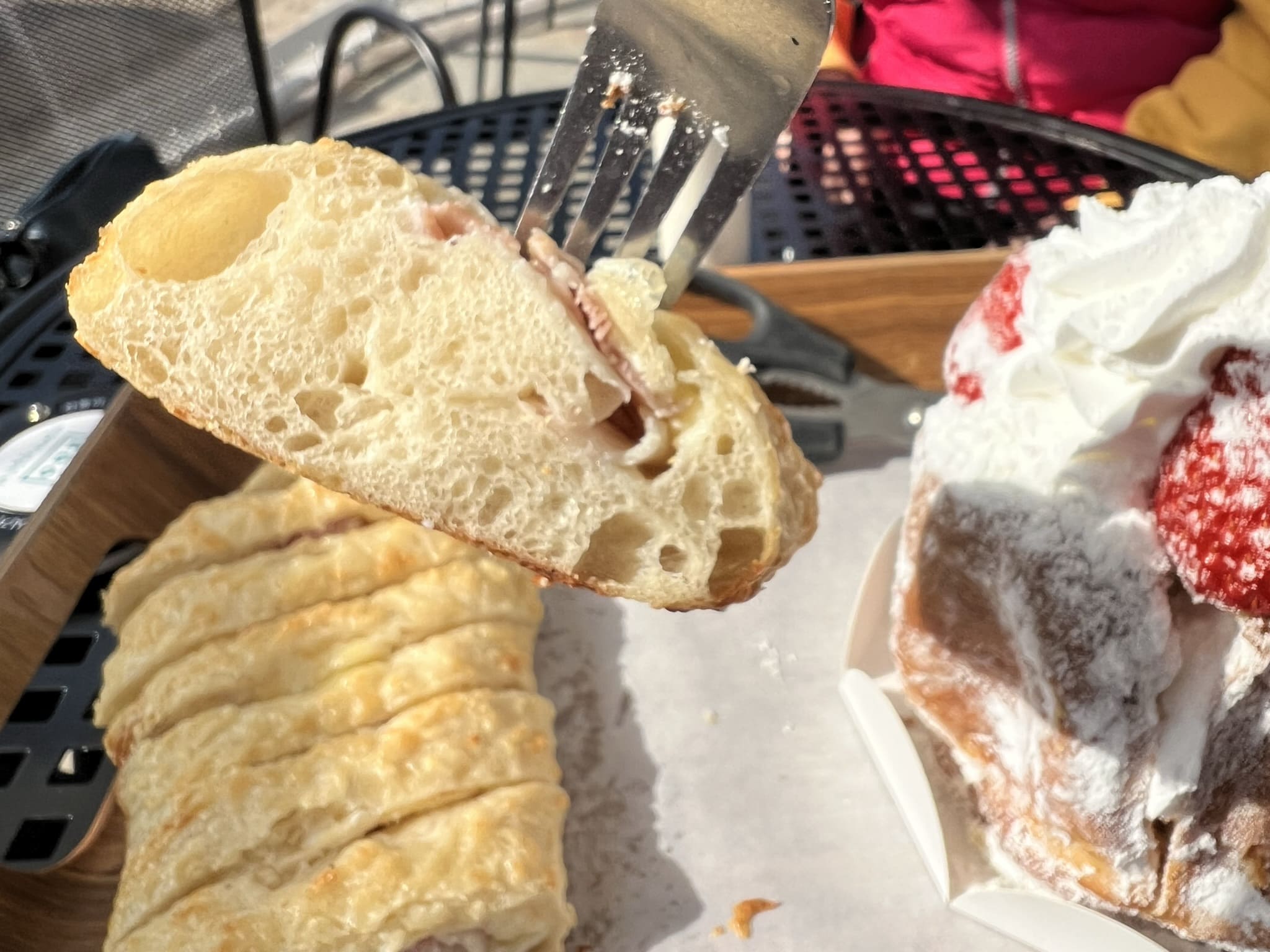 이 집은 딸기를 이용한 빵이 참 많았던 거 같습니다. 따듯한 음료와 함께 곁들여 먹을 두 종류의 빵을 같이 시켜봤습니다. 왼쪽은 치아바타입니다. 두 빵 모두 이탈리아의 빵이라고 하네요.