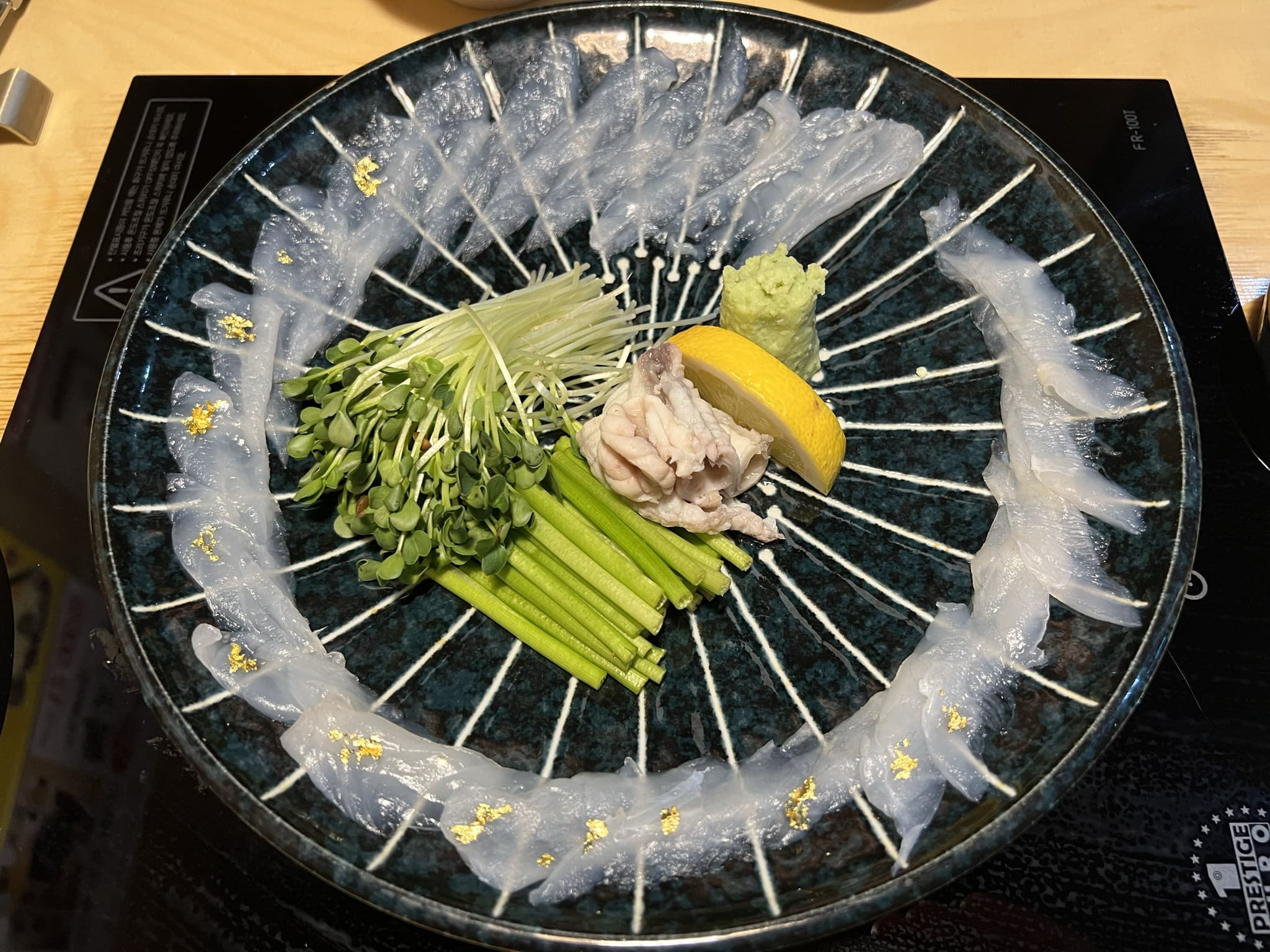 금가루가 뿌려진 복사시미 입니다. 복 껍질 삶은 것, 레몬과 미나리 무순도 함께 제공되는데요. 잘못썬 복 사시미는 질겨진다고 하는데, 실력이 좋으신지 되게 부드럽고 녹듯이 사라졌습니다. 개인적으로 복요리 중 가장 맛있게 먹은 파트였습니다. 정말 녹듯이 사라진다는 걸 잘 느꼈네요.