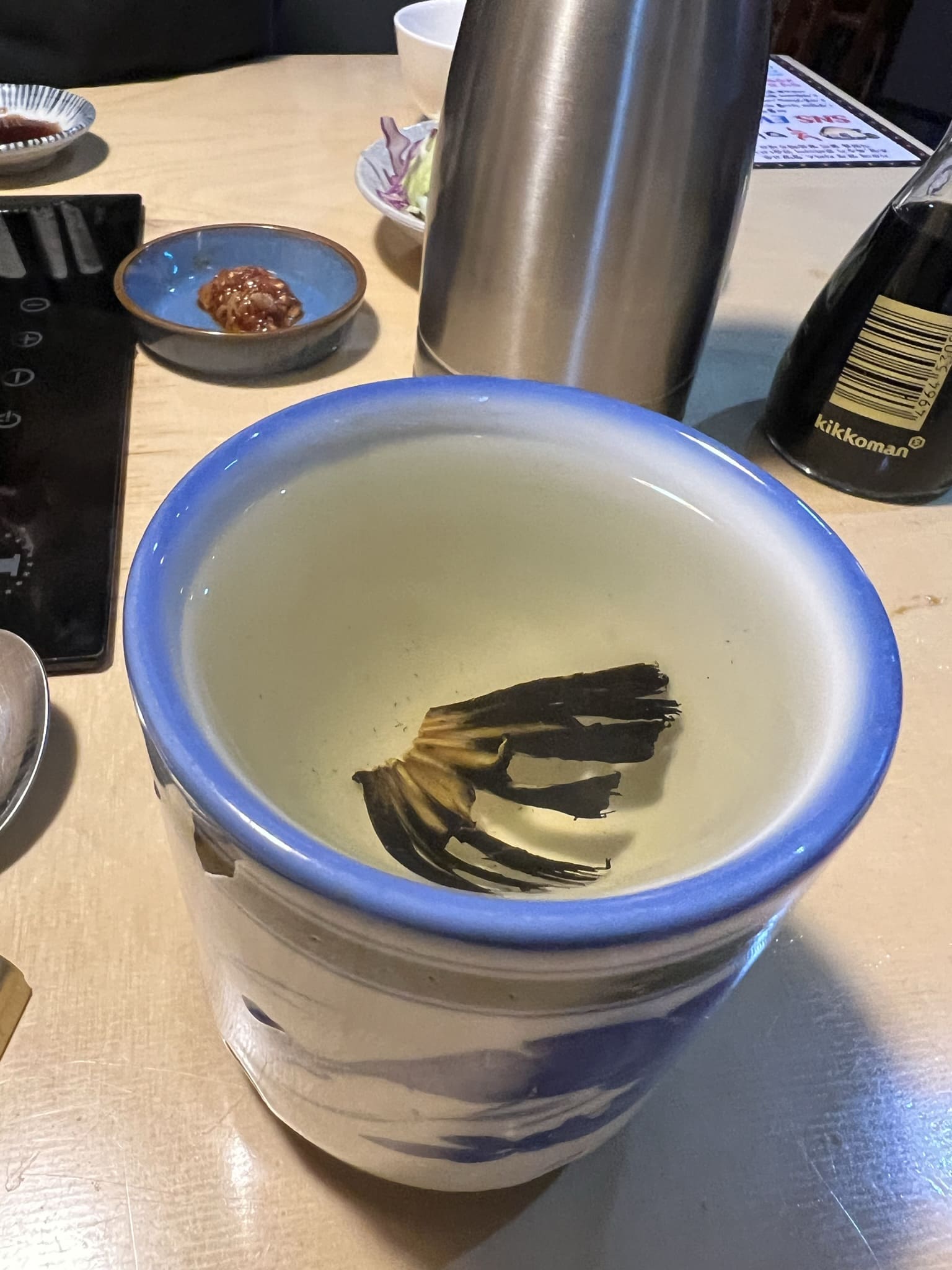 저희는 스페셜 코스를 즐기기로 했습니다. 많은 코스의 정석이죠. 속을 달래주고 준비운동을 시켜줄 죽입니다. 복어죽이라고 하는데, 복어맛이 크게 난다기 보다는 깔끔하고 담백하게 애피타이져로 즐기기 좋은 죽이었습니다. 술로는 희래사케(지느러미 술)를 시켰습니다. 참치등의 지느러미를 뜨거운 사케에 담가 비릿하지만 오묘한 느낌을 선사해 주는 사케입니다.