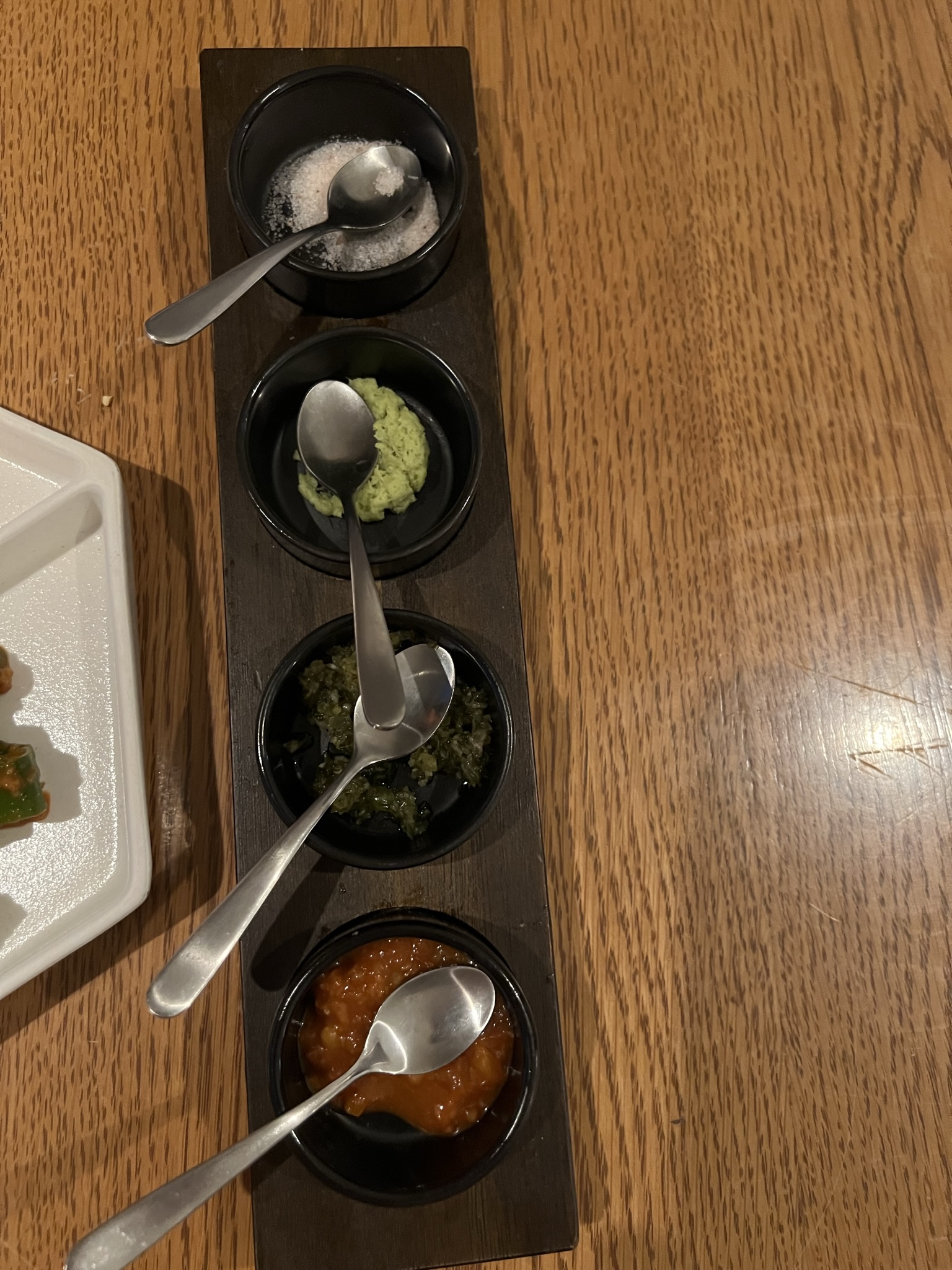 다양한 나물로 전을 붙이고 식용꽃으로 장식해 준 화전을 필두로, 동치미와 3종류의 김치 그리고 고기와 함께 먹을 4종류의 소스입니다. 수경재배로 직접 키운 채소로 만든 쌈과 겉절이도 일품이네요. 가게 한편에 키우고 있는 게 보였던 거 같아요.