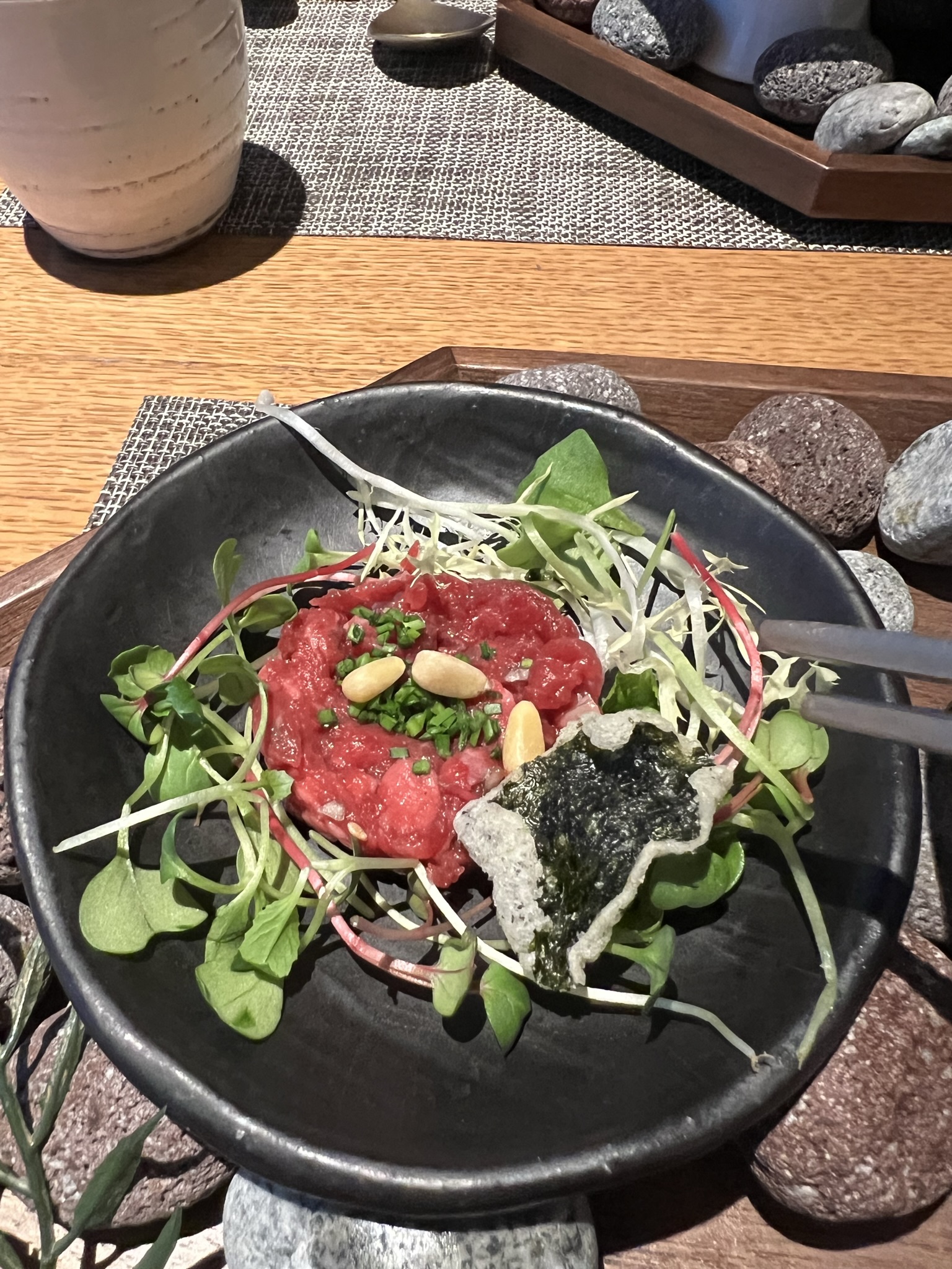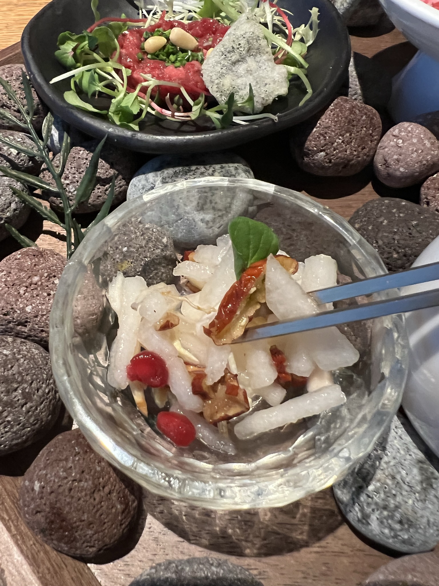 코스 진입을 시작하며, 식욕을 돋구와줄 애피타이져 차림입니다. 육회와, 계절죽(단호박죽), 수삼샐러드, 문어 오이선입니다. 하나하나가 각기 다른 매력의 맛으로 다양하게 입맛을 살려줬는데요. 담백 한과 새콤한 달콤함 짭짤함을 체험시켜 주어 식욕의 활성화를 도와주었습니다. 차림의 상 꾸밈인 돌도 너무 예쁘게 장식되어 뷰뿐만 아니라 음식을 보는 즐거움도 선사해 주네요.