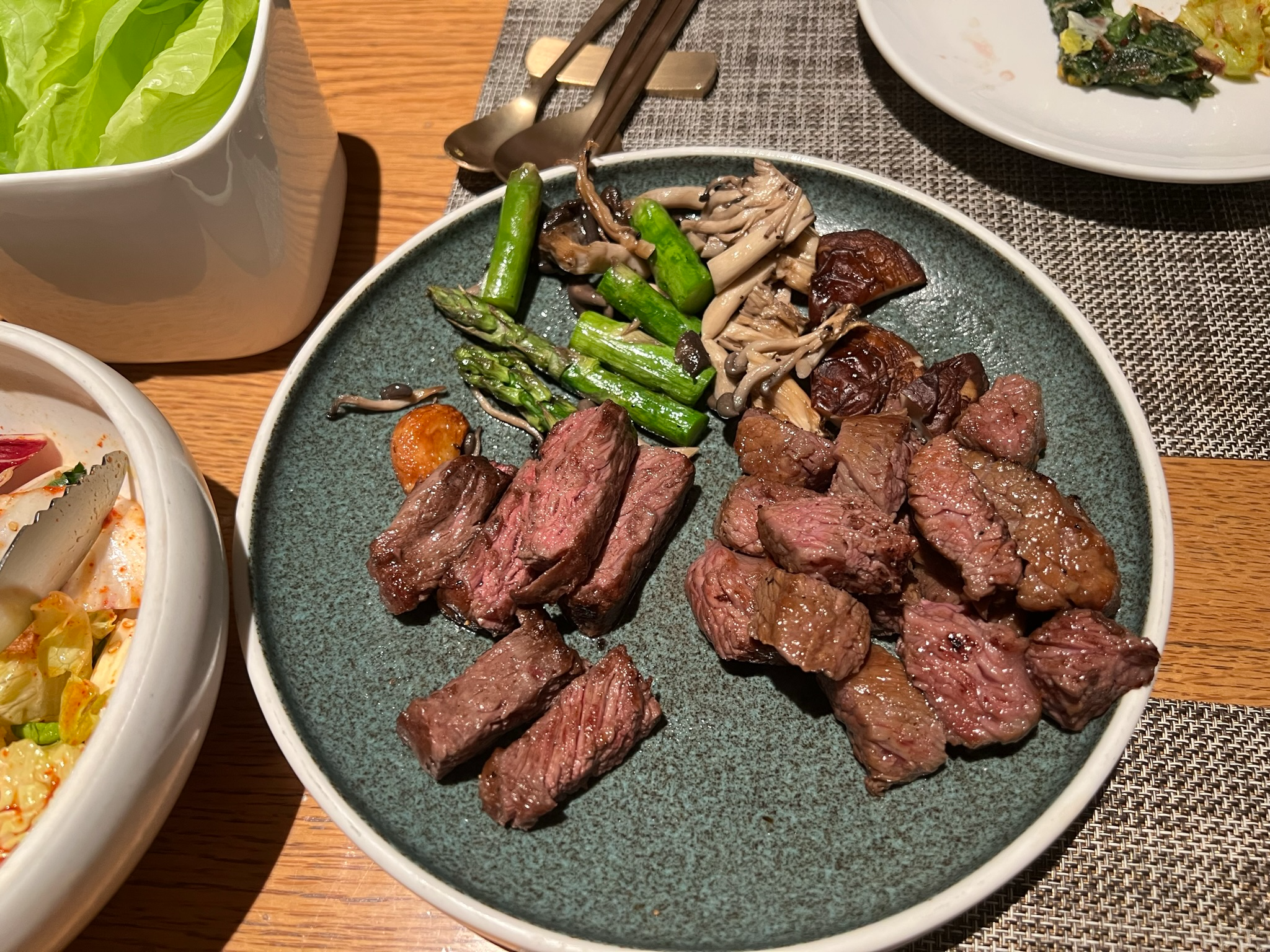 초벌 한 한우를 불판에 먹기 좋게 추가로 익혀주십니다. 저희는 미디엄레어로 익혀달라고 요청드렸는데 핑크빛 속살과 마이야르가 잘 일어난 겉면의 상반된 조화가 잘 어우러진 한점 한 점입니다. 입에 넣으면 진한 한우의 마블링 풍미와 부드럽게 녹아내리는 살결이 혀와 입천장을 덮어줍니다.