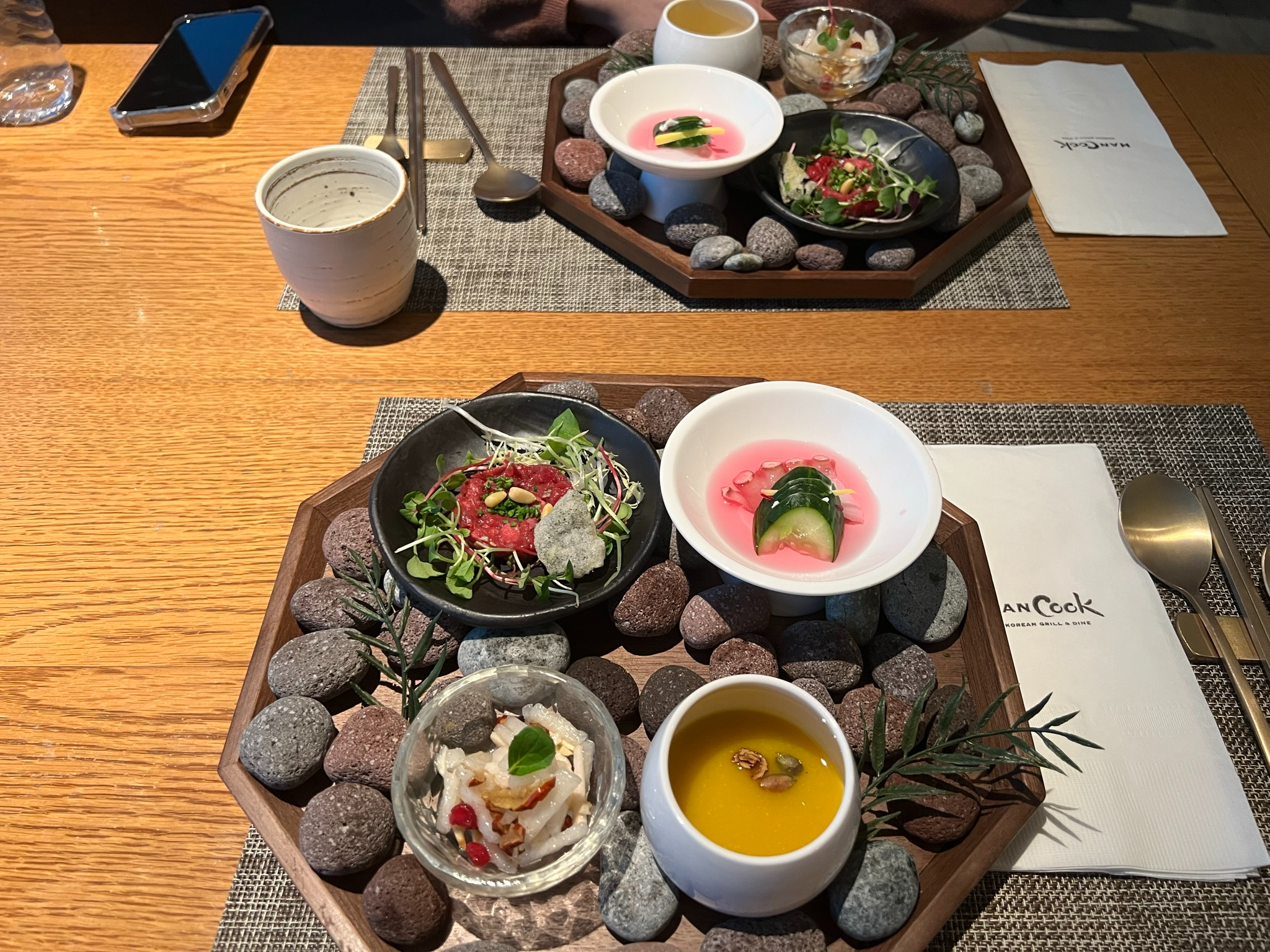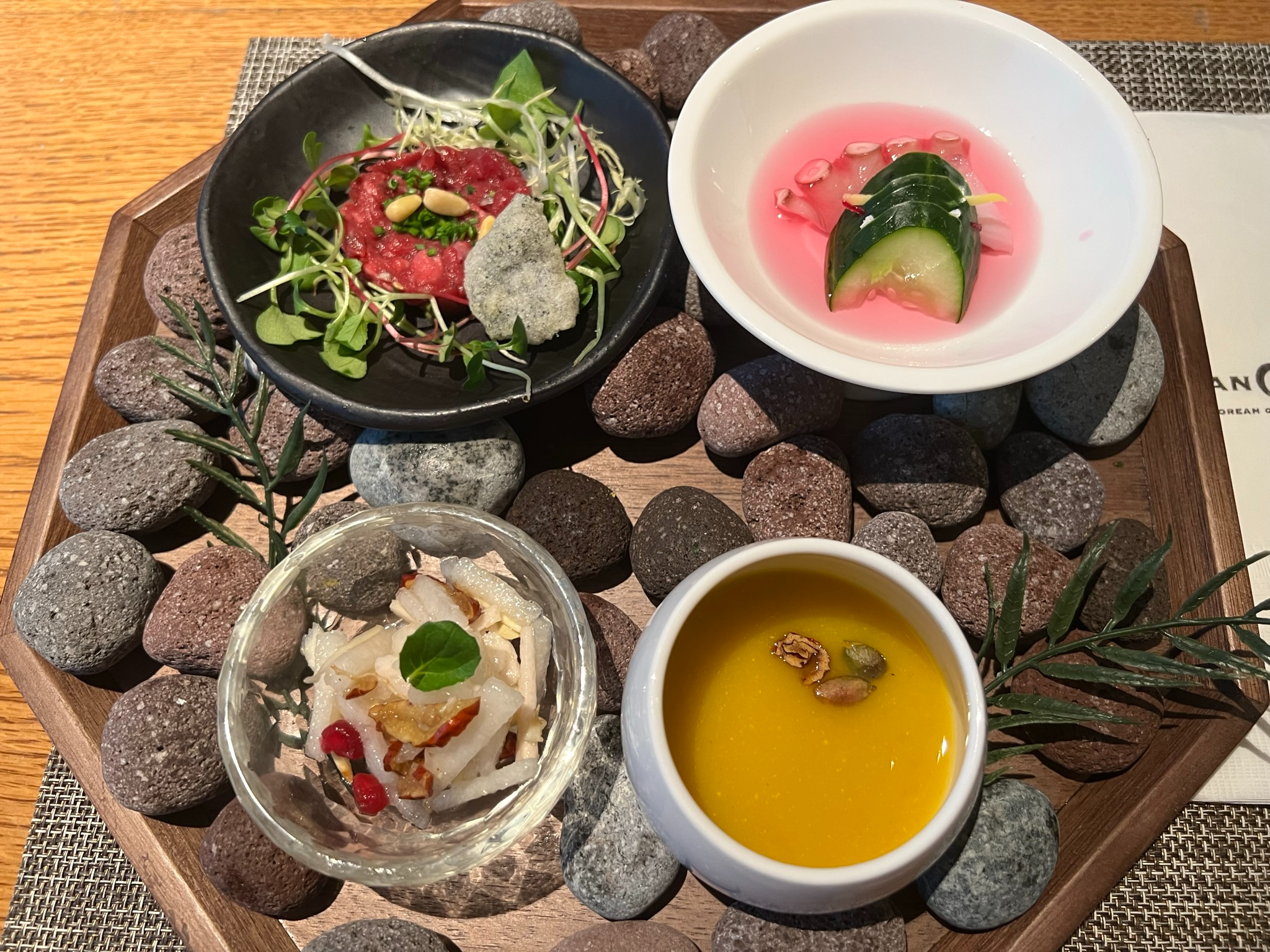 코스 진입을 시작하며, 식욕을 돋구와줄 애피타이져 차림입니다. 육회와, 계절죽(단호박죽), 수삼샐러드, 문어 오이선입니다. 하나하나가 각기 다른 매력의 맛으로 다양하게 입맛을 살려줬는데요. 담백 한과 새콤한 달콤함 짭짤함을 체험시켜 주어 식욕의 활성화를 도와주었습니다. 차림의 상 꾸밈인 돌도 너무 예쁘게 장식되어 뷰뿐만 아니라 음식을 보는 즐거움도 선사해 주네요.