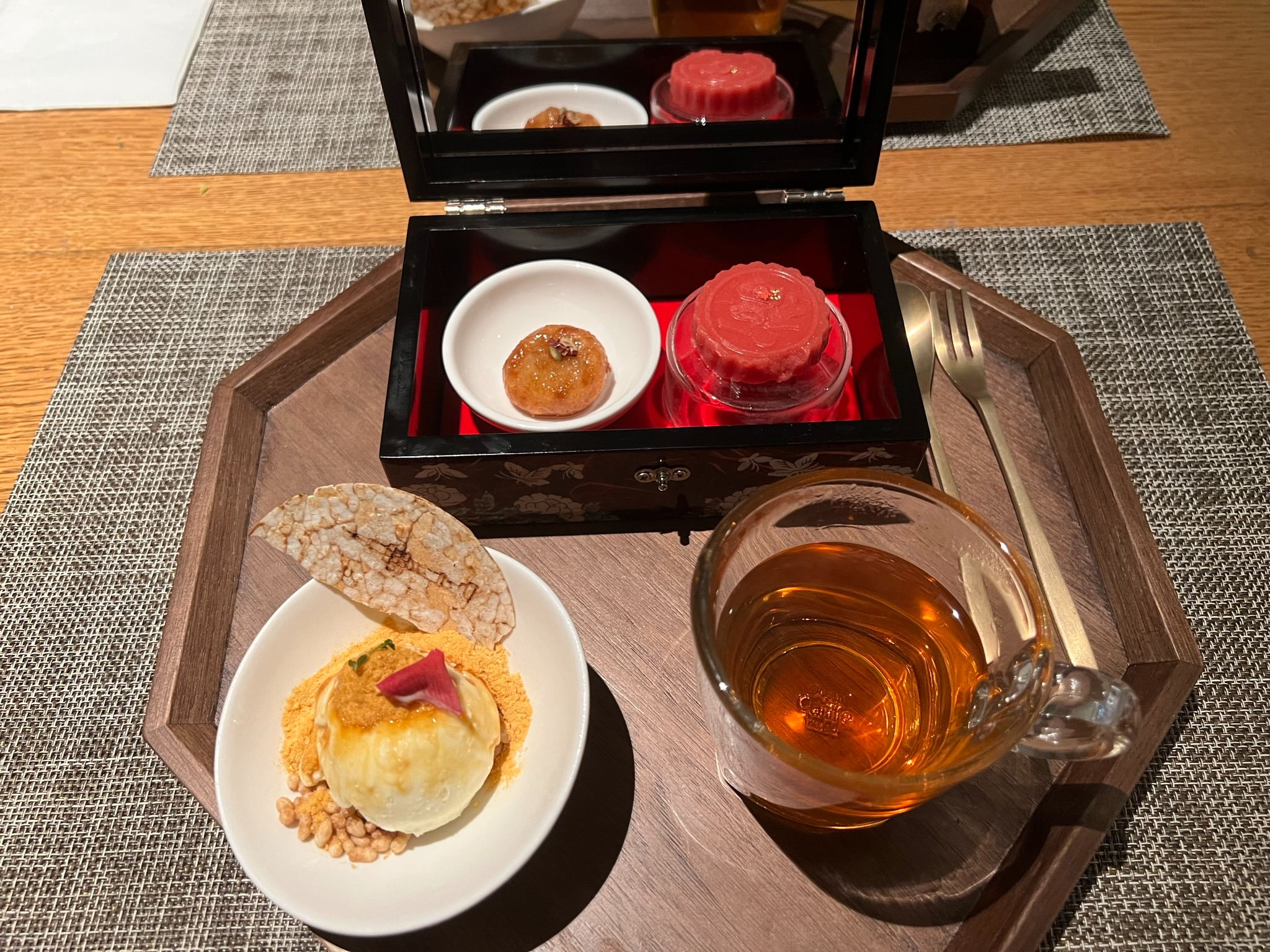 한과와 쫄깃한 경단을 예쁜함에 담아주고, 달콤한 아이스크림과 향긋한 차로 구성된 디저트입니다. 마무리까지 고급스럽고 깔끔하네요. 저 함은 구매할 수 있다고 하는데, 저희는 따로 구매하지 않았습니다. 있으면 좋을 것도 같은...