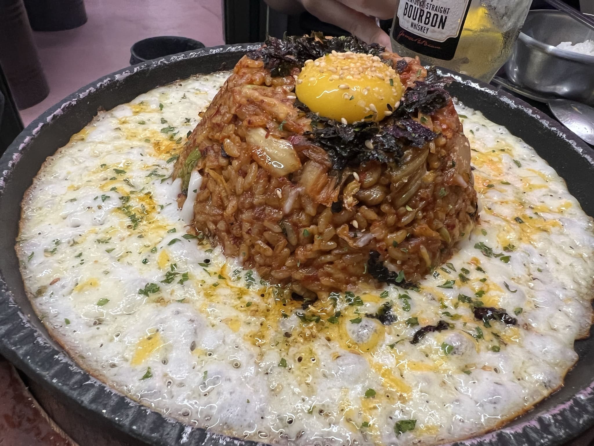고기 먹을 때 빠지면 섭섭한 계란찜과 볶음밥도 시켜서 먹었습니다. 폭탄 계란찜은 치즈와 달콤한 소스맛이 잘 어우러졌습니다. 나왔을 때는 유독 더 뜨거운 거 같았어요. 조심해서 드셔야 합니다. 볶음밥은 기본적인 고추장맛이 튀는 김치볶음밥을 치즈로 바닥을 깔아주고 그 위에 올려준 메뉴입니다. 치즈가 함박눈처럼 와있고, 볶음밥도 한가득이네요. 별미였습니다.