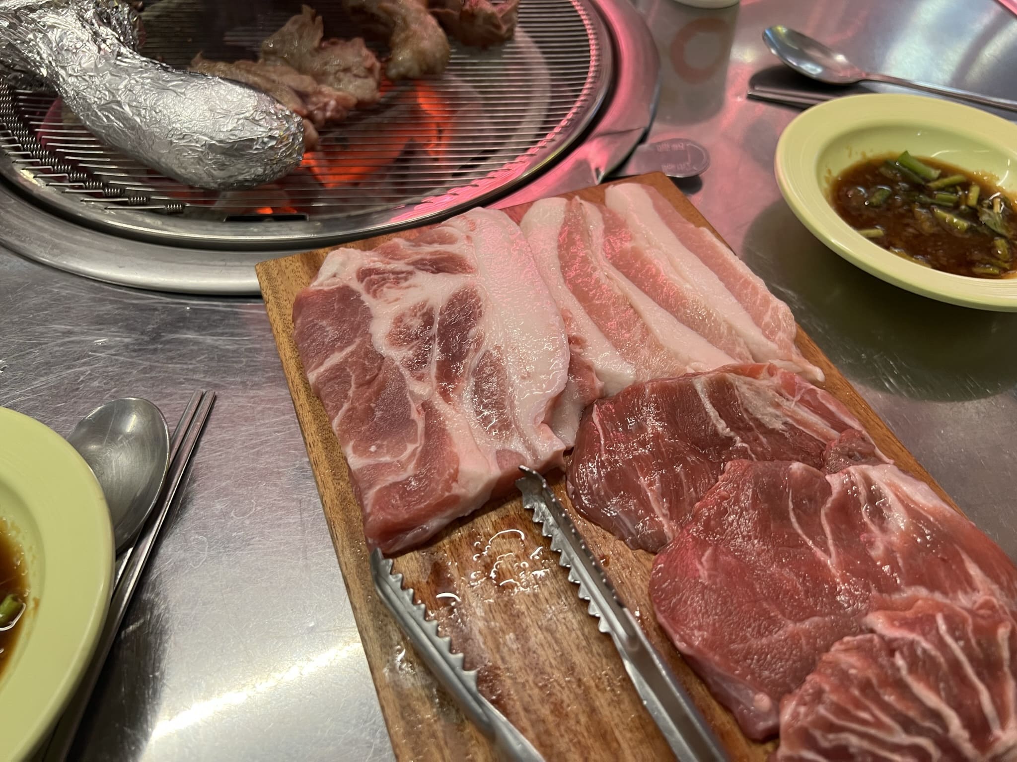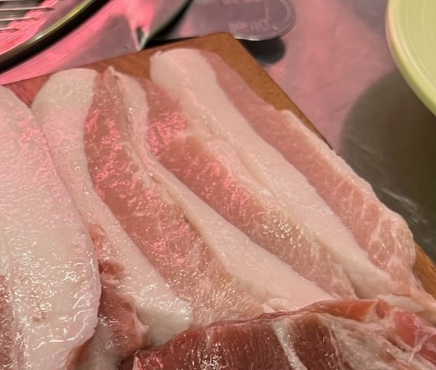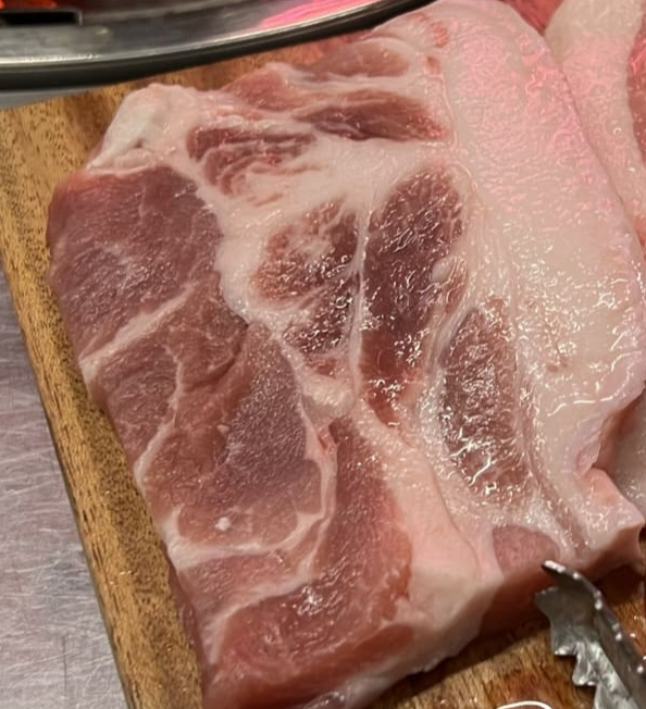 꽃살입니다. 돼지의 목살과 앞다리 쪽에 분포하는 살로, 소의 꽃등심처럼 적절하게 분포된 지방의 맛이 매력적인 부위입니다. 아쉽게도 생고기 상태를 못 찍었어요. 배가 너무 고파서 허겁지겁 먹는 준비 하느라...