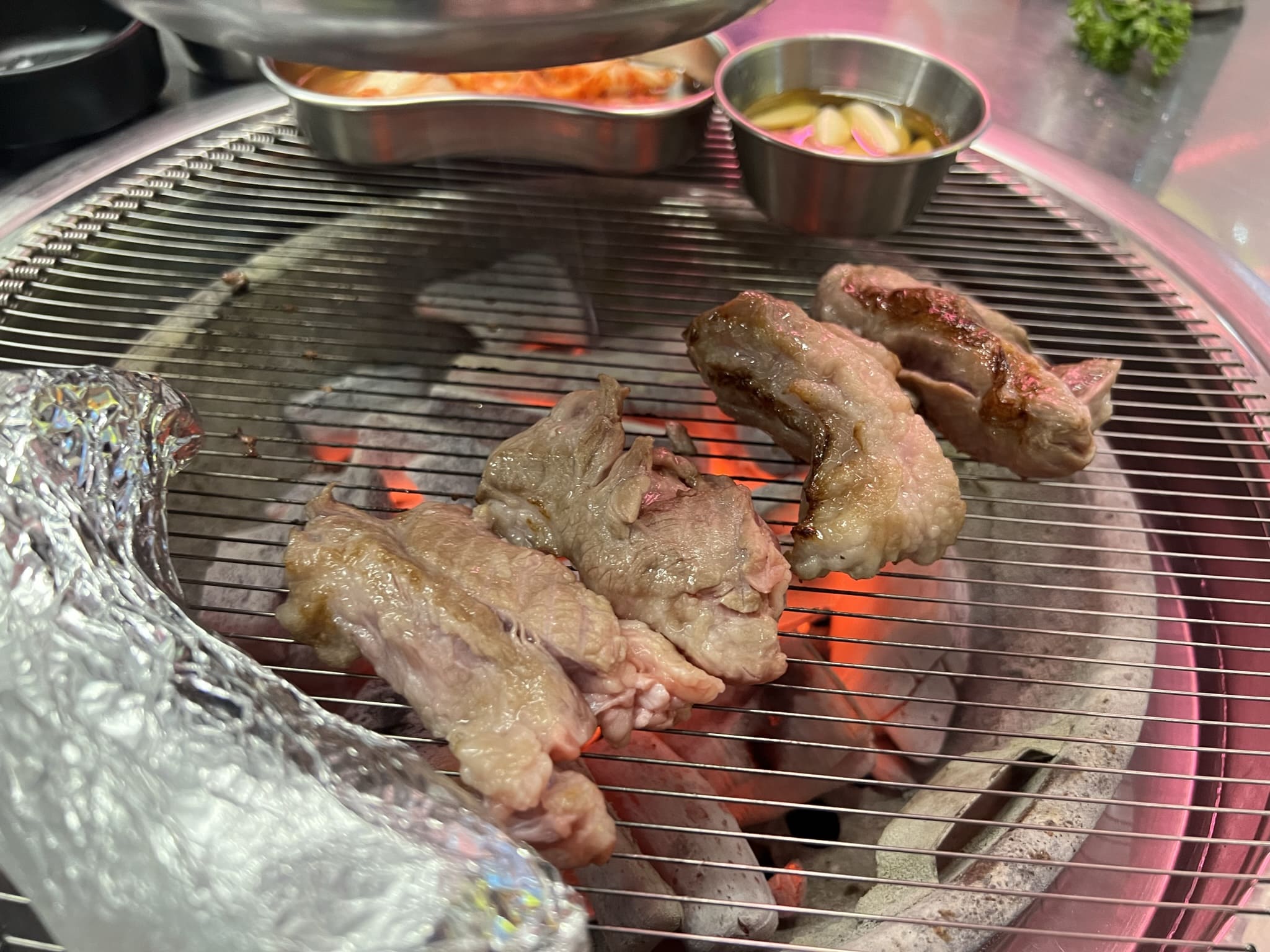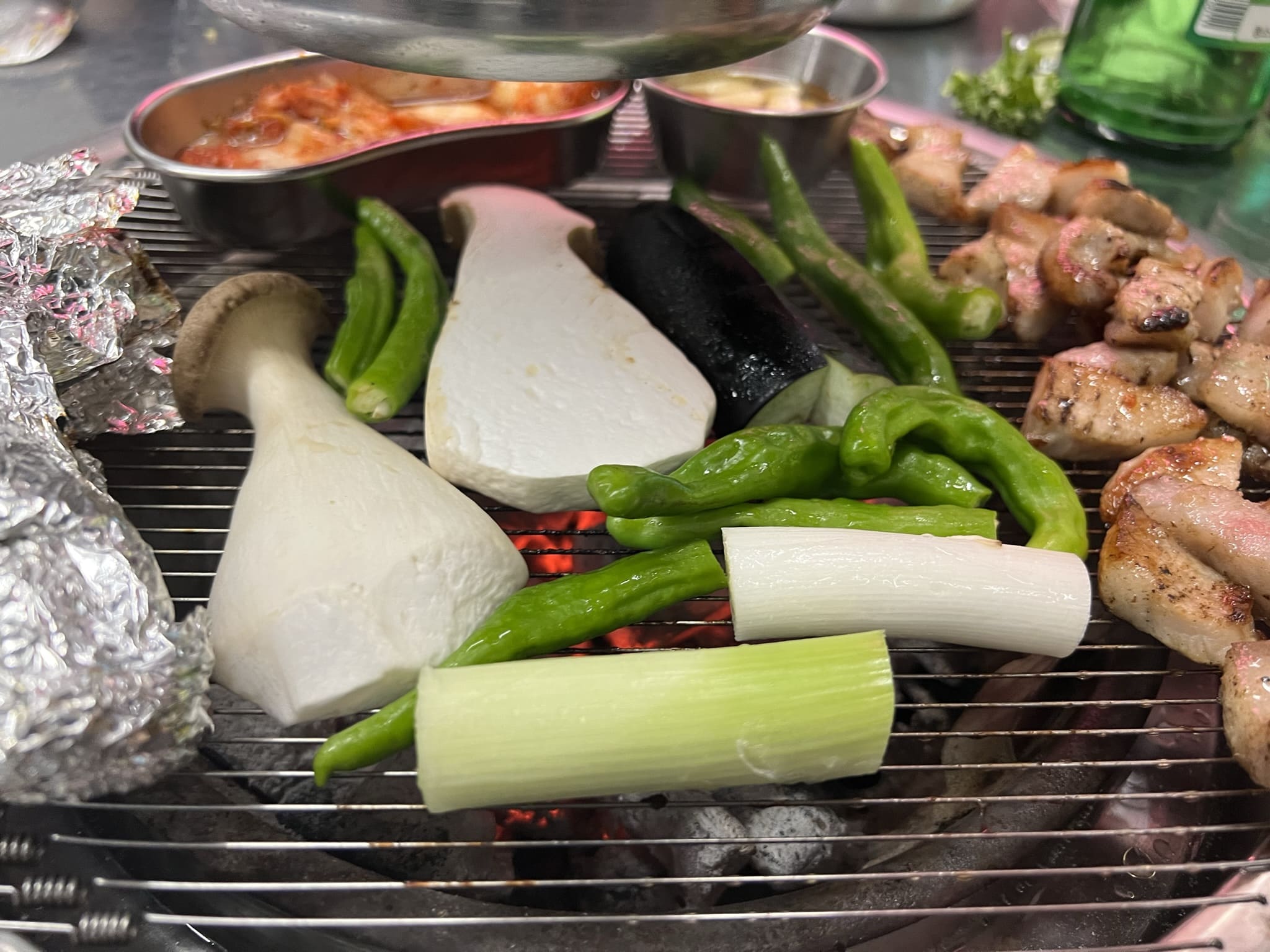 익어가는 고기와 함께 다양한 채소도 함께 구워 먹습니다. 새송이 버섯은 직화로 굽기도 하고, 알루미늄 호일에 감싸서 굽기도 하는데요. 알루미늄 호일에 감싸서 구우면 촉촉함이 유지되어 익기 때문에 가리비를 먹는듯한 식감을 즐길 수 있어요. 하지만 익는데 좀 오래 걸립니다. 꽈리고추와 대파 가지도 함께 구워서 먹으니 다양한 맛을 즐길 수 있는 시간이었어요.