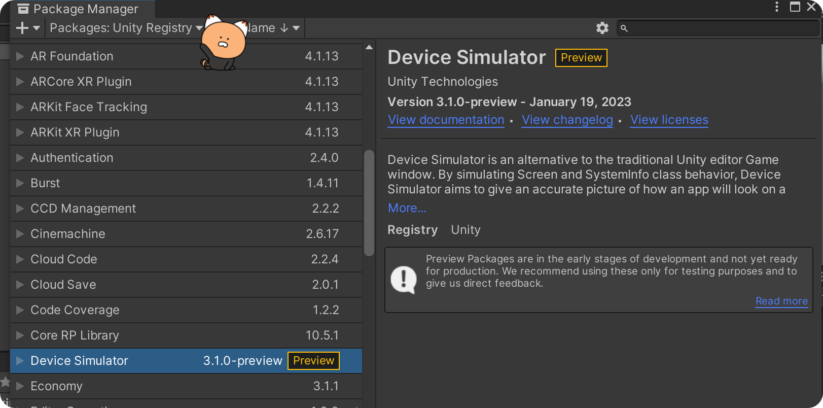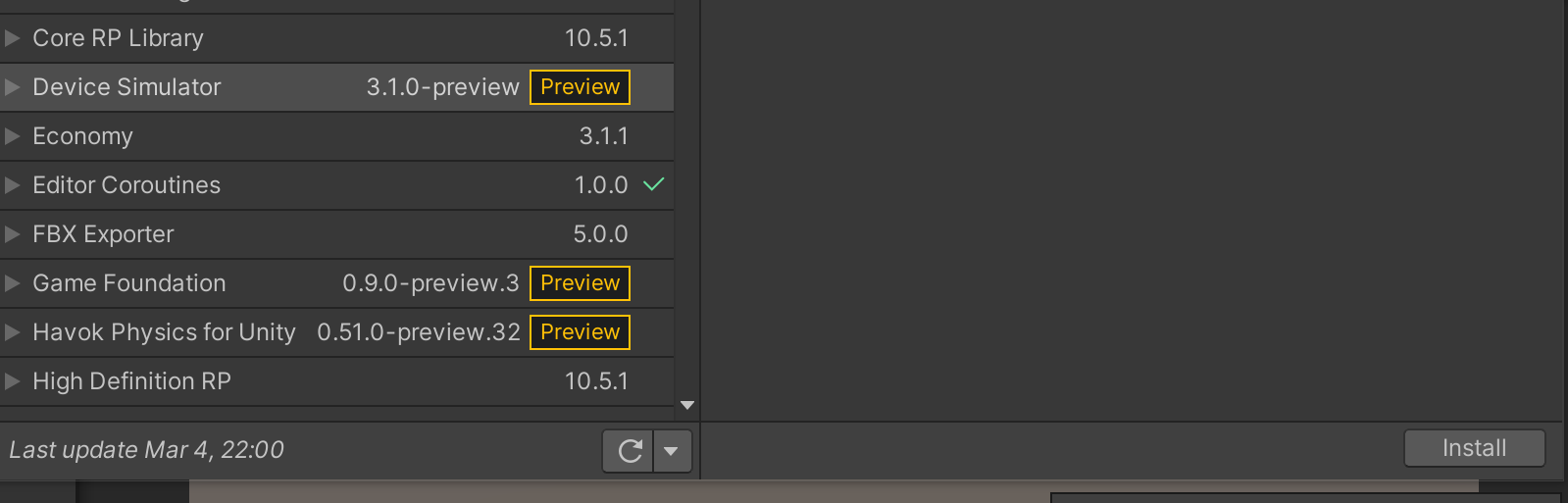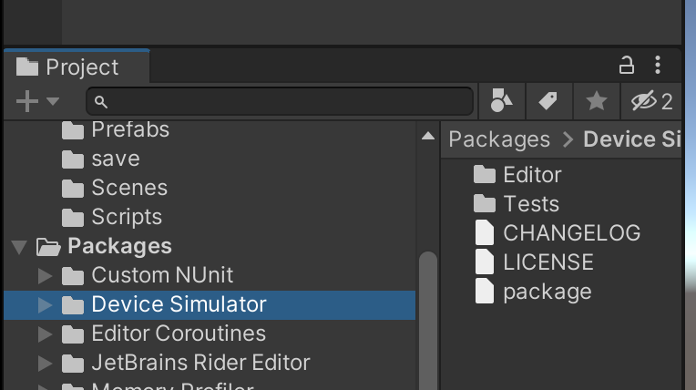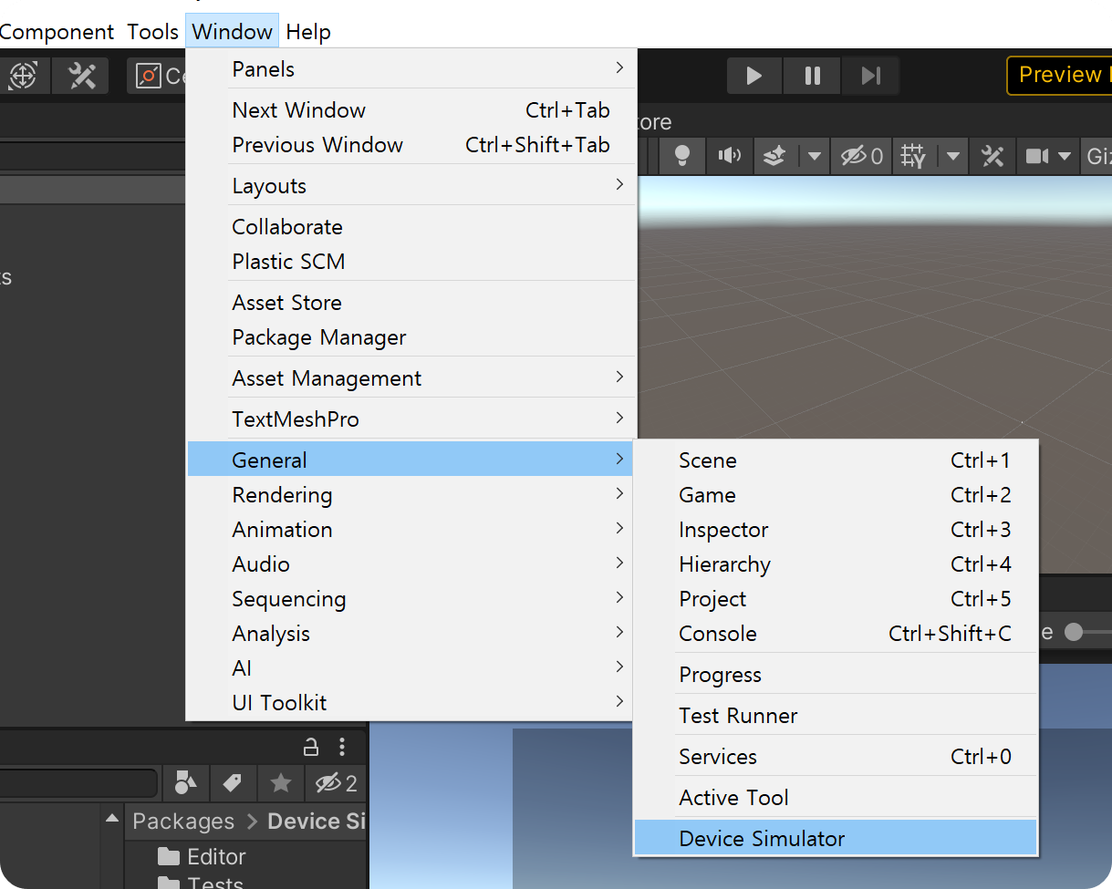 2) Package manager에서 Unity Registry 구성에서 Device Simulator 확인