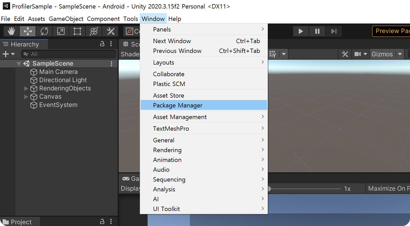 1) 메뉴 - Window - Package Manager