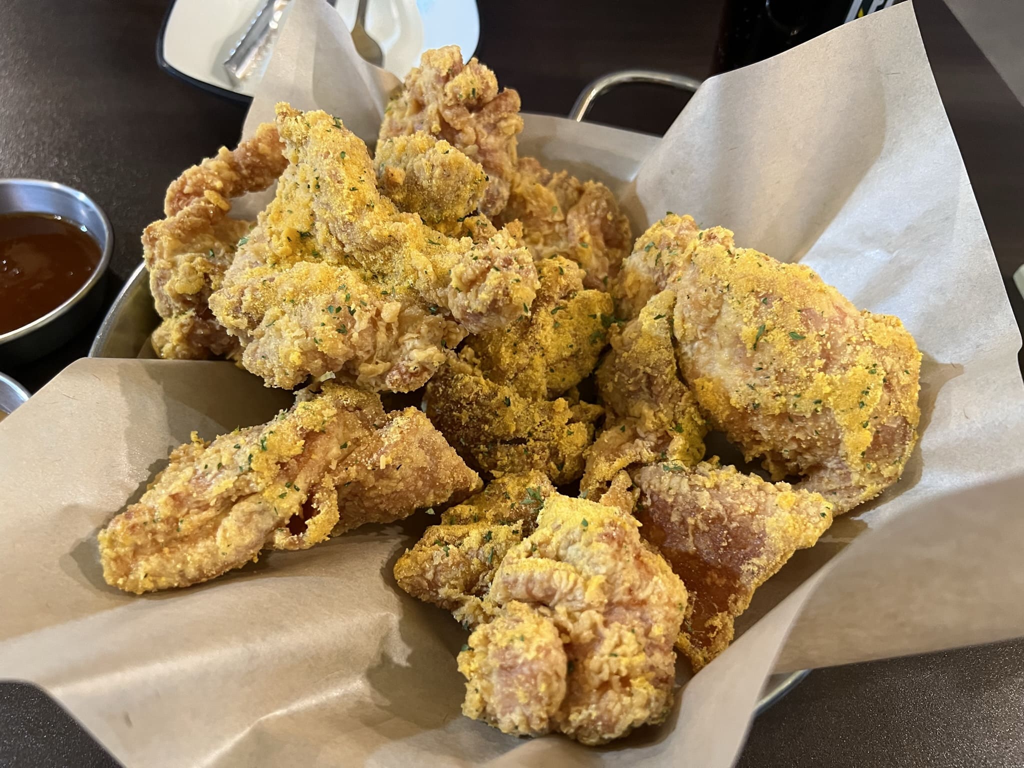 이 집에 들어오게 된 이유는 바삭하고 고소한 치킨의 냄새에 이끌려서였는데요. 배신하지 않는 냄새였습니다. 실제로 기본 튀김옷에 간이 잘 되어 있고, 살도 꽉 차있는데 튀김옷이 너무나도 예술이었어요. 이 집은 닭껍질 튀김 잘할거에요. 확실합니다. (실제로 손님들이 많이 드시더라고요) 같이주는 소스도 두종류나 되었는데요. 취향껏 질리지 않게 골고루 맛을 느낄 수 있었습니다. 만약 다음에 오면 치즈 시즈닝 없이 그냥도 먹어봐야겠네요.