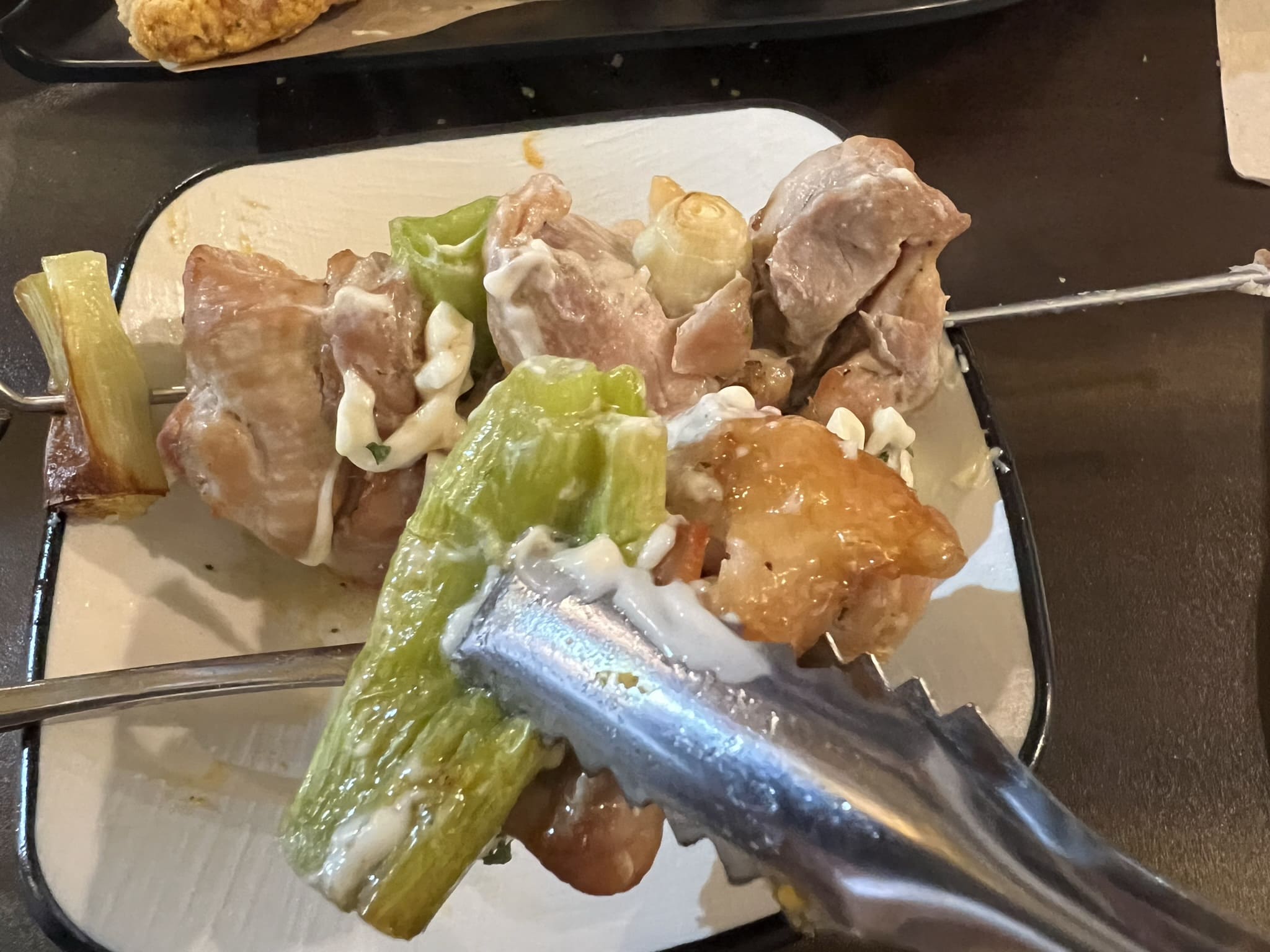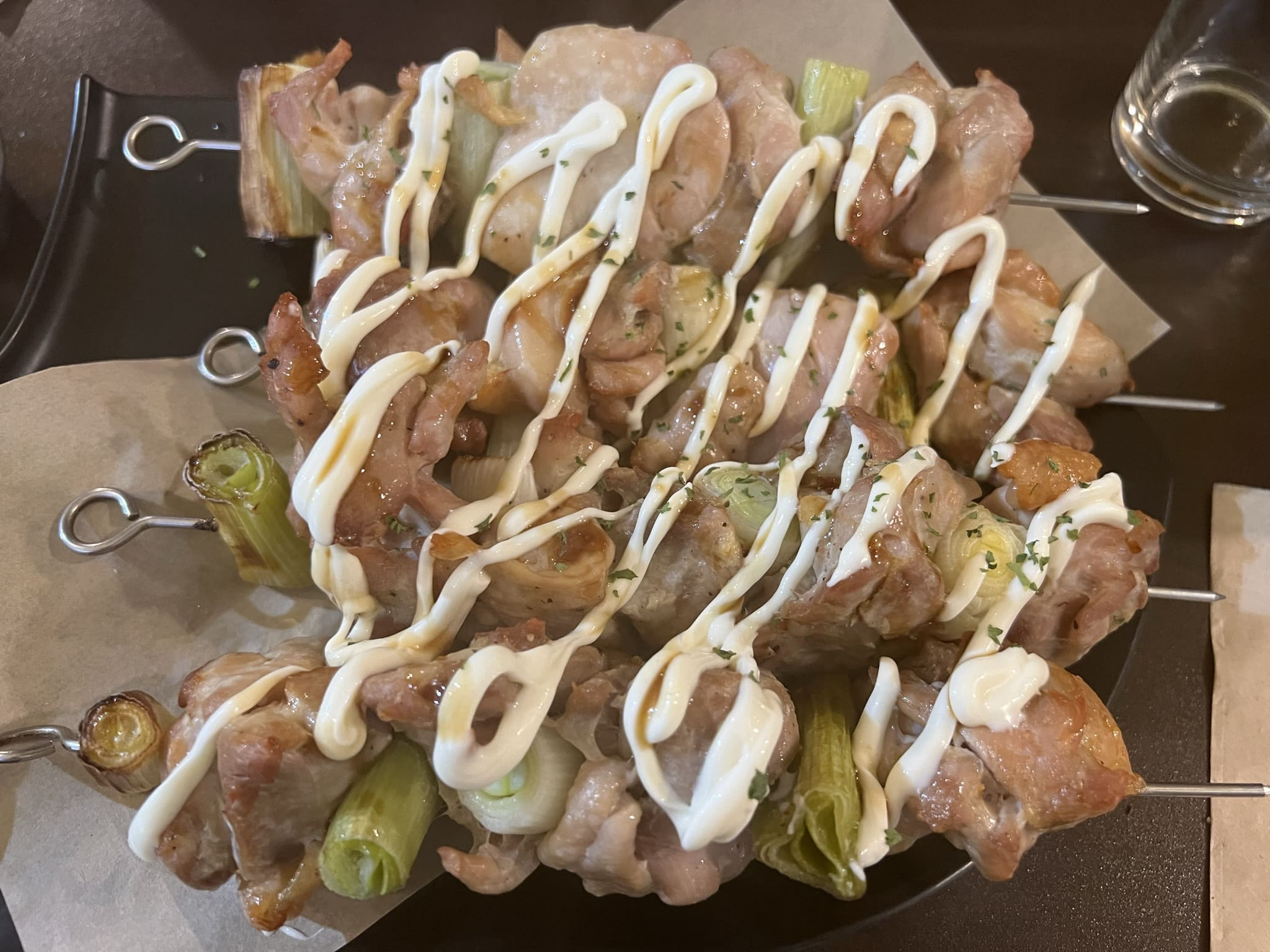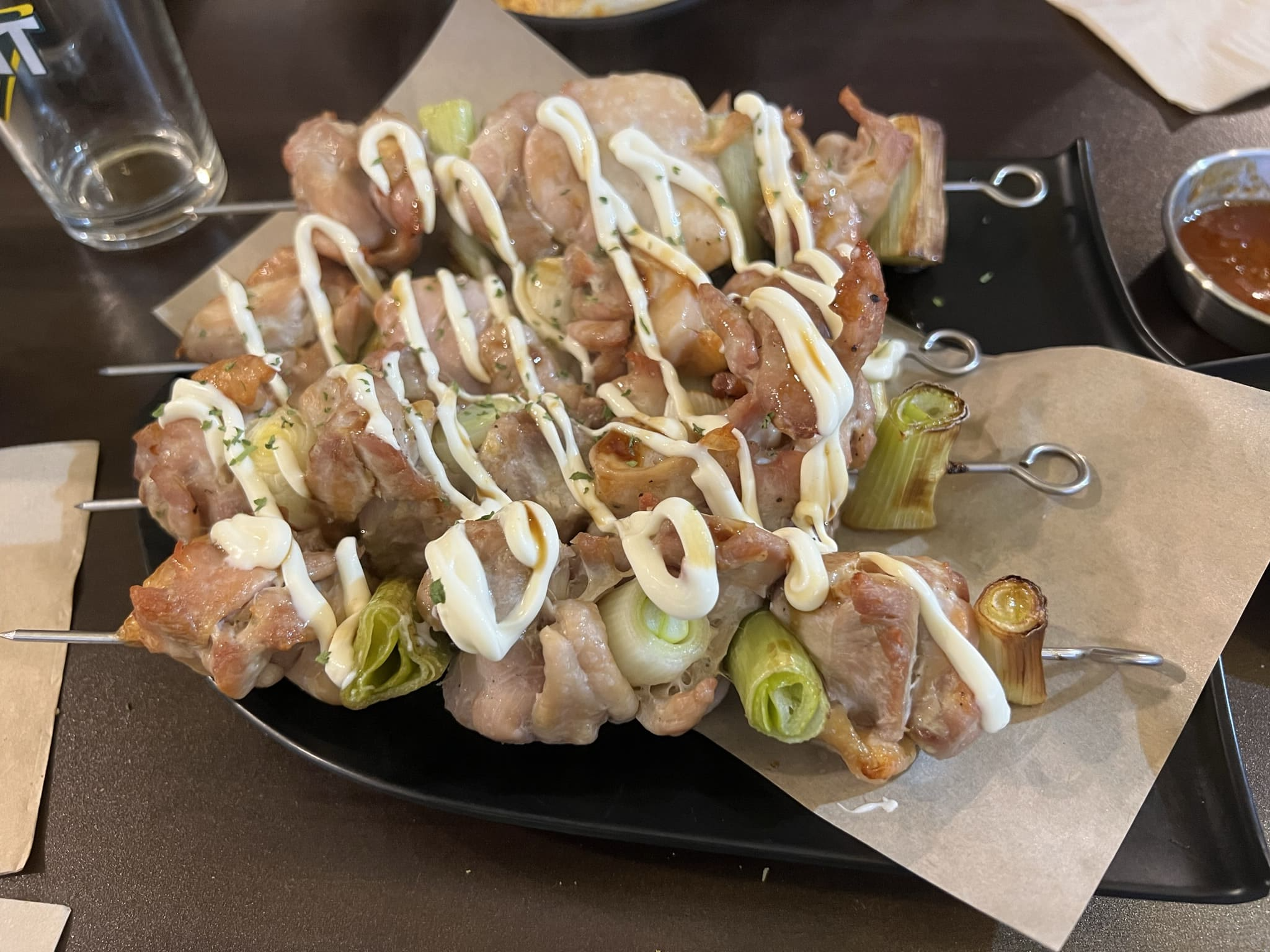 이집은 특이한 메뉴가 하나 있었어요. 파와 닭을 꼬치에 꽂아 오븐에 구워주는 음식인데요. 메뉴 자체는 신기할게 아니었지만 치킨집에서 이렇게 파는 건 많이 못 본 거 같아 시켜 보았습니다. 닭은 따로 간이 안되어 있었지만 향긋한 구운 파와 닭고기를 같이 먹어주면 매력적인 맛을 느낄 수 있었습니다. 고기도 육즙이 아주 쥬시 하게 느껴져 취향을 저격해 버렸지 뭐예요. 간 자체는 크게 안되어 있으니 싱거울 수 있겠지만, 위에 뿌려진 마요네즈나 같이 주는 소스에 찍어먹으면 그만이죠 뭐.