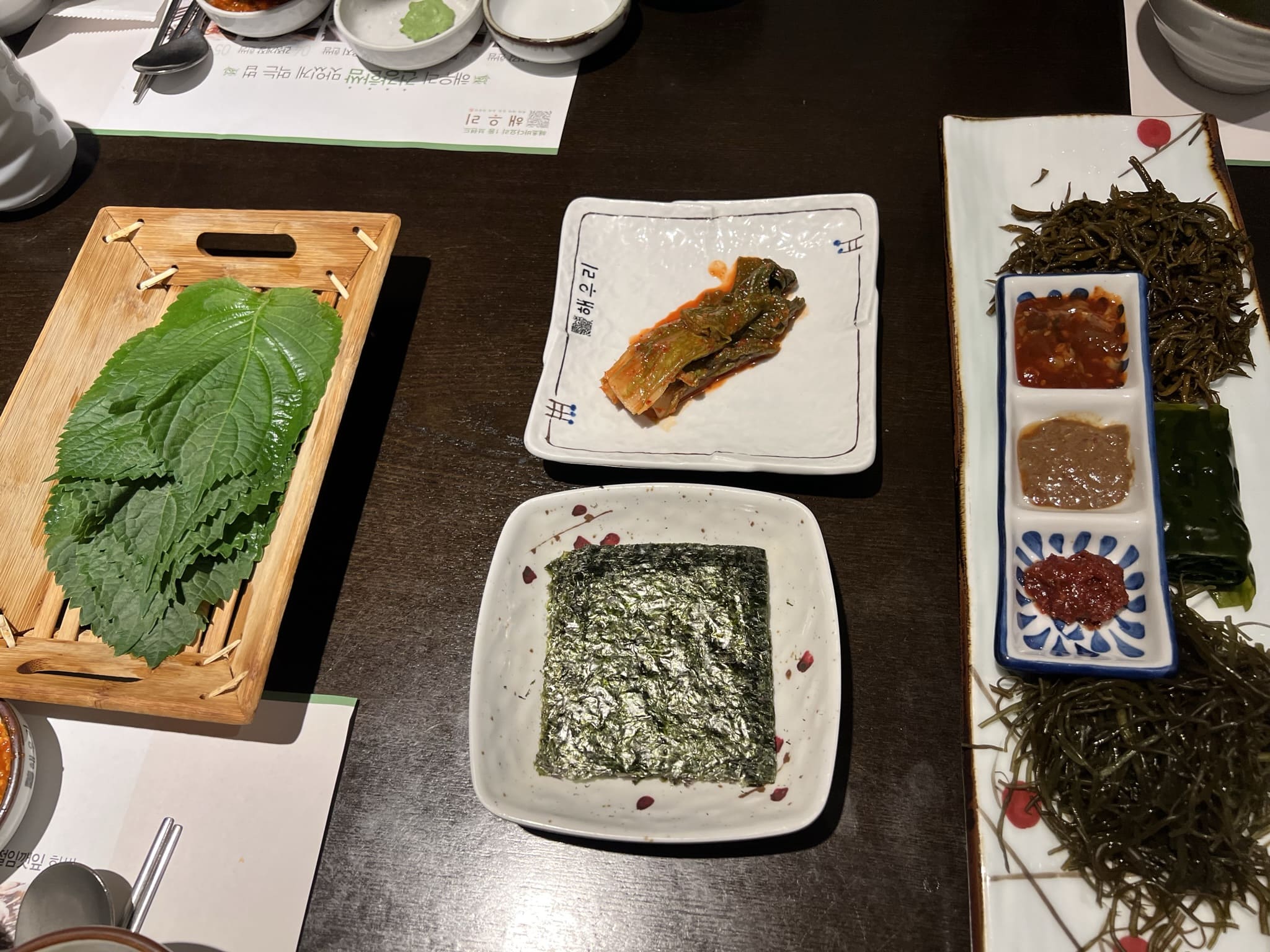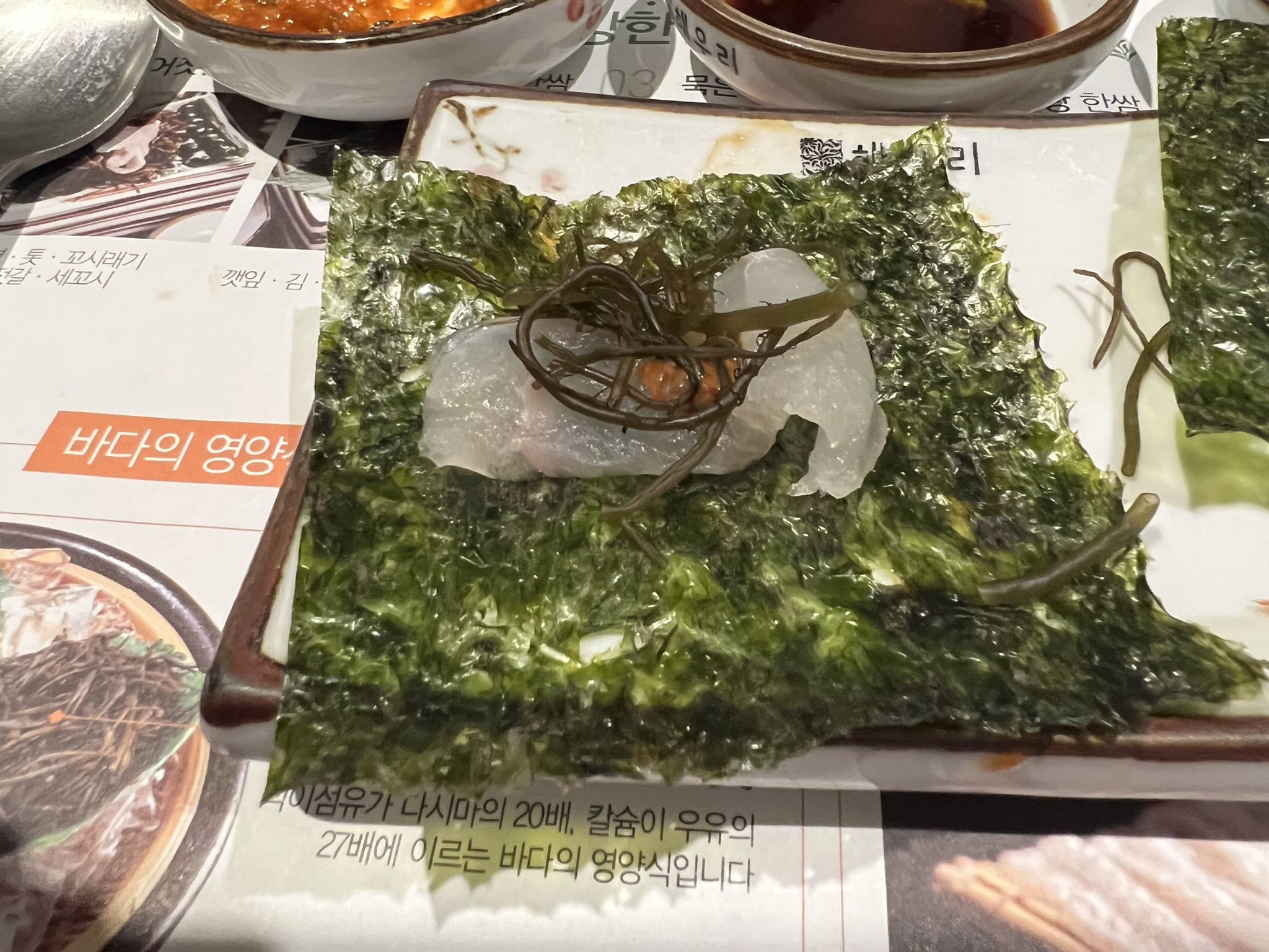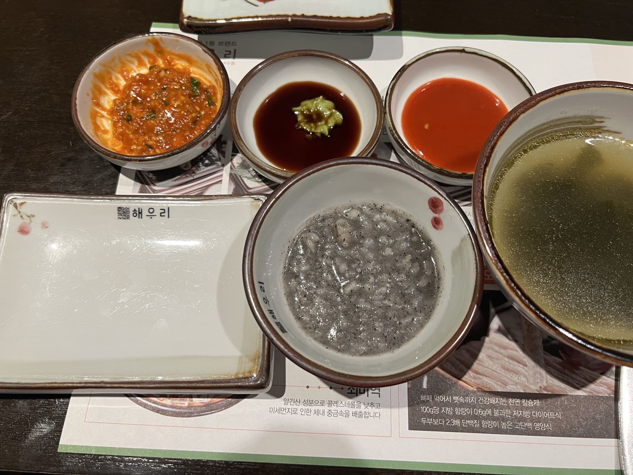애피타이져로 나온 죽과 미역국, 곁들일 양념장과 온갖 쌈과 반찬들 입니다. 해초쌈 위에 올려져 있는 것은 젓갈들입니다. 전라도 쪽이 젓갈이 유명하다고 하는데, 비린맛 때문에 호불호가 있다고 합니다. 저는 개인적으로 곁들여 먹기에는 좋았습니다.