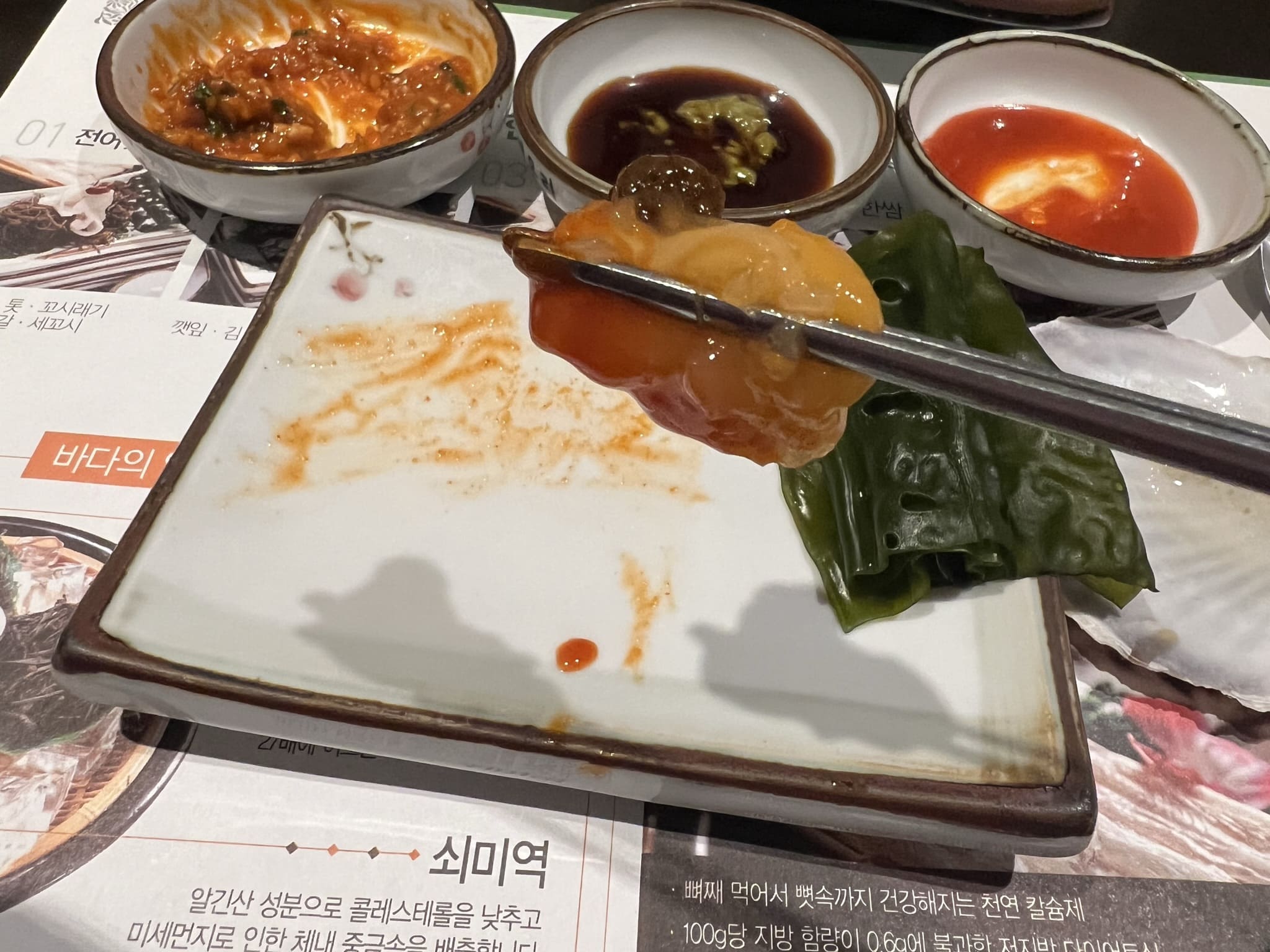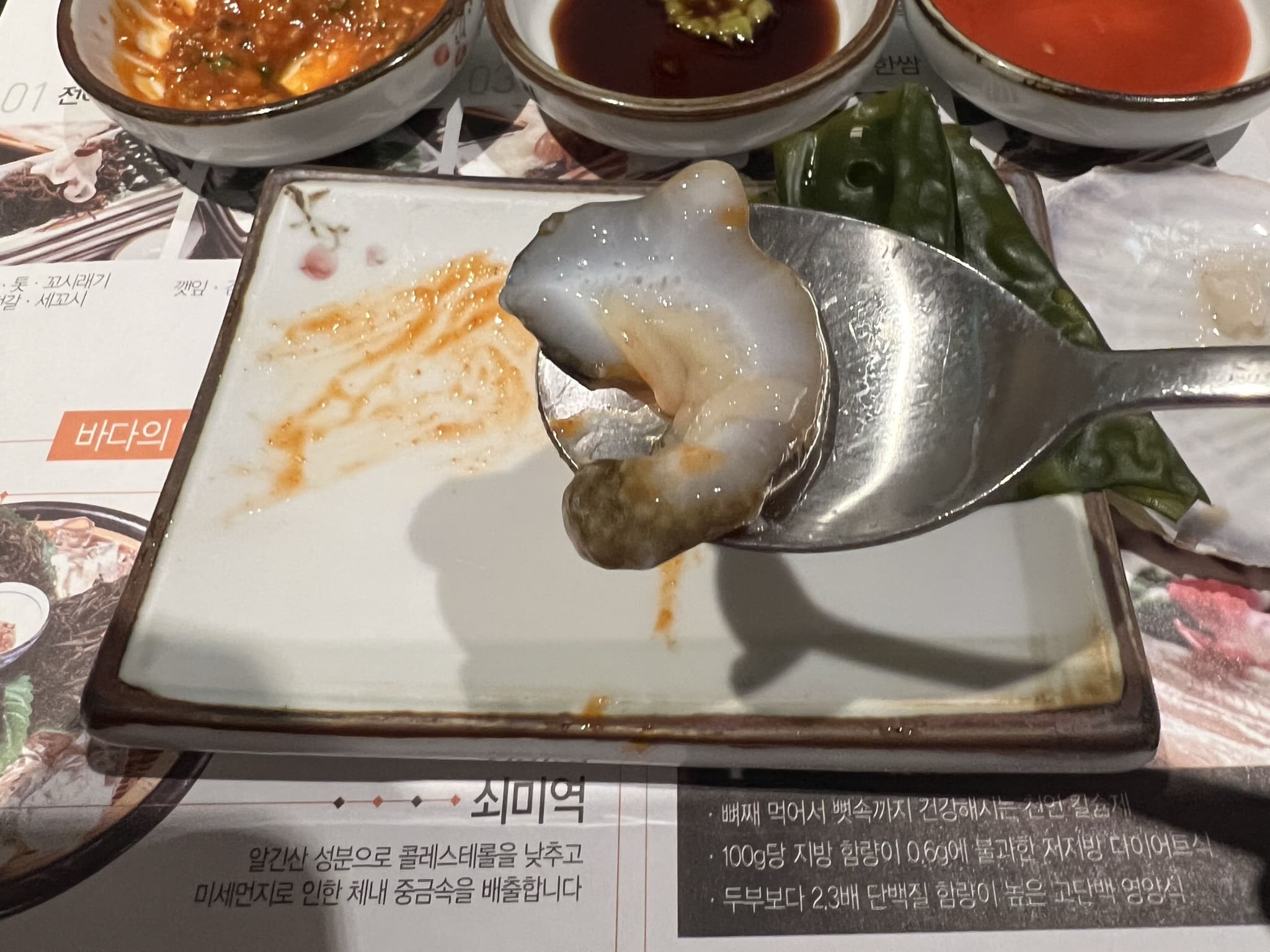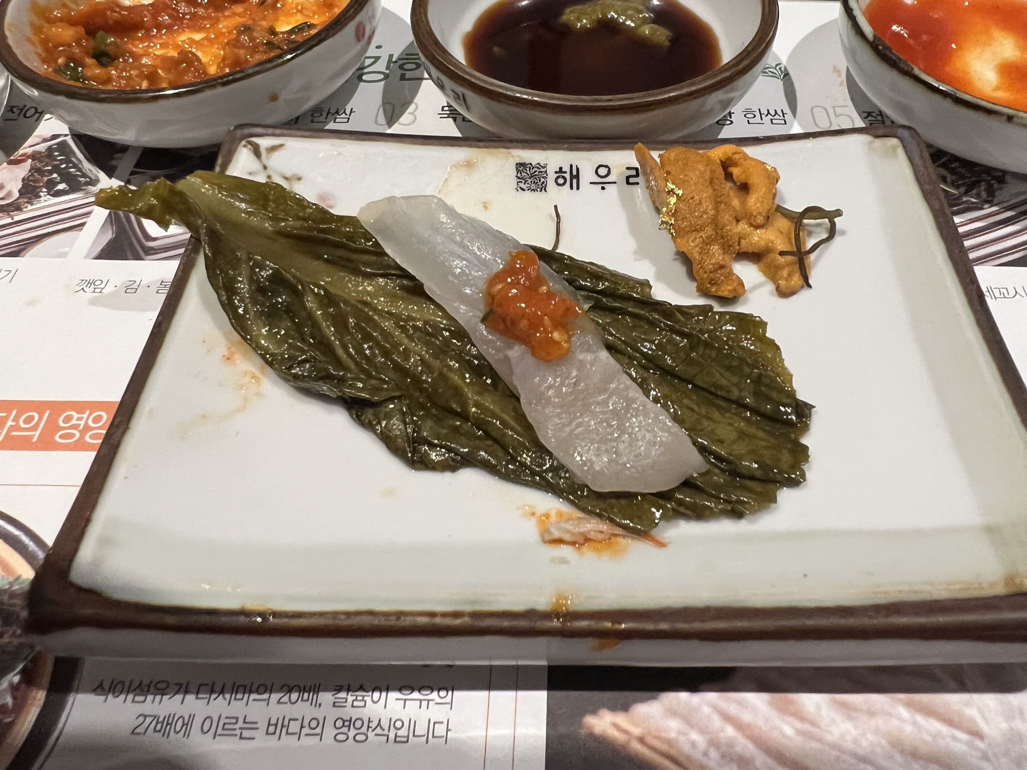 애피타이져로 나온 죽과 미역국, 곁들일 양념장과 온갖 쌈과 반찬들 입니다. 해초쌈 위에 올려져 있는 것은 젓갈들입니다. 전라도 쪽이 젓갈이 유명하다고 하는데, 비린맛 때문에 호불호가 있다고 합니다. 저는 개인적으로 곁들여 먹기에는 좋았습니다.