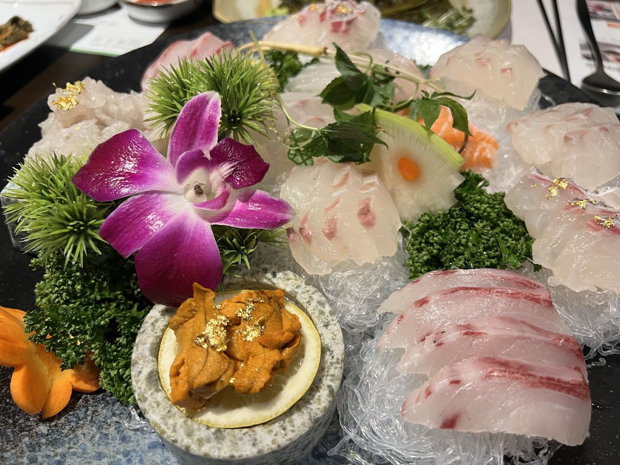금가루가 뿌려진 성개알과 온갖 생선회로 구성된 모둠 회입니다. 숭어나 광어 방어도등 다양하게 구성되어 있습니다. 개인적으로는 도미와 광어가 제일 맛났어요. 역시 흰 살 생선회 최고입니다.