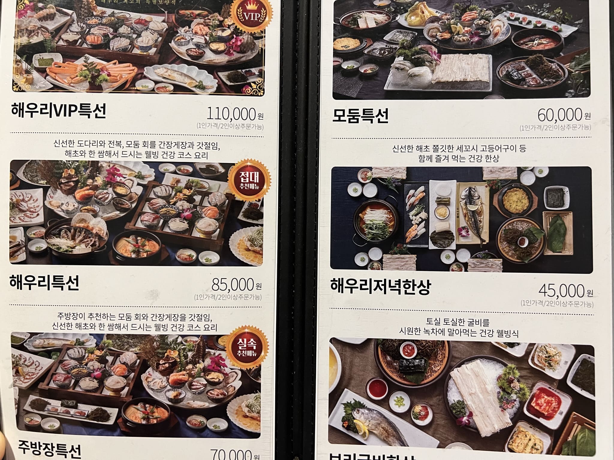 이날은 저녁 코스 중 [해우리 특선]을 먹어 보았습니다. 모둠 회와 간장게장을 메인으로 여러 가지 반찬과 쌈 그리고 매운탕과 요리들을 즐길 수 있었습니다.