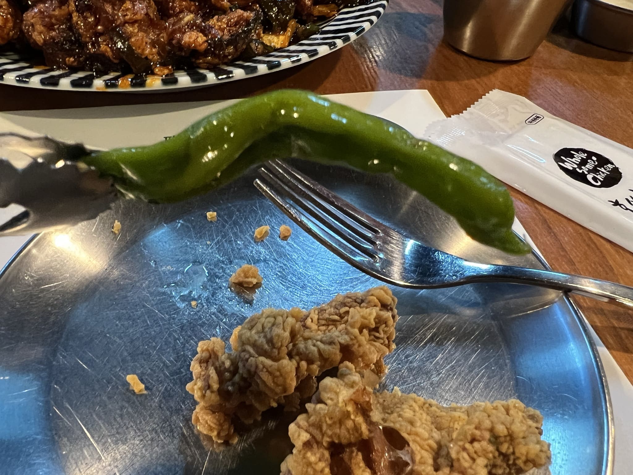 먼저 나온것은 고추 치킨이었습니다. 고추치킨이라고 해서 고추장 같은 소스의 치킨을 상상했었는데, 고추장보다는 매콤한 치킨 양념이었던 거 같아요. 거기에 다진 고추들이 매콤하니 잘 어울렸습니다. 구운 꽈리고추가 함께 올려져 나왔습니다. 꽈리고추가 올라간 치킨은 처음 본 거 같습니다.