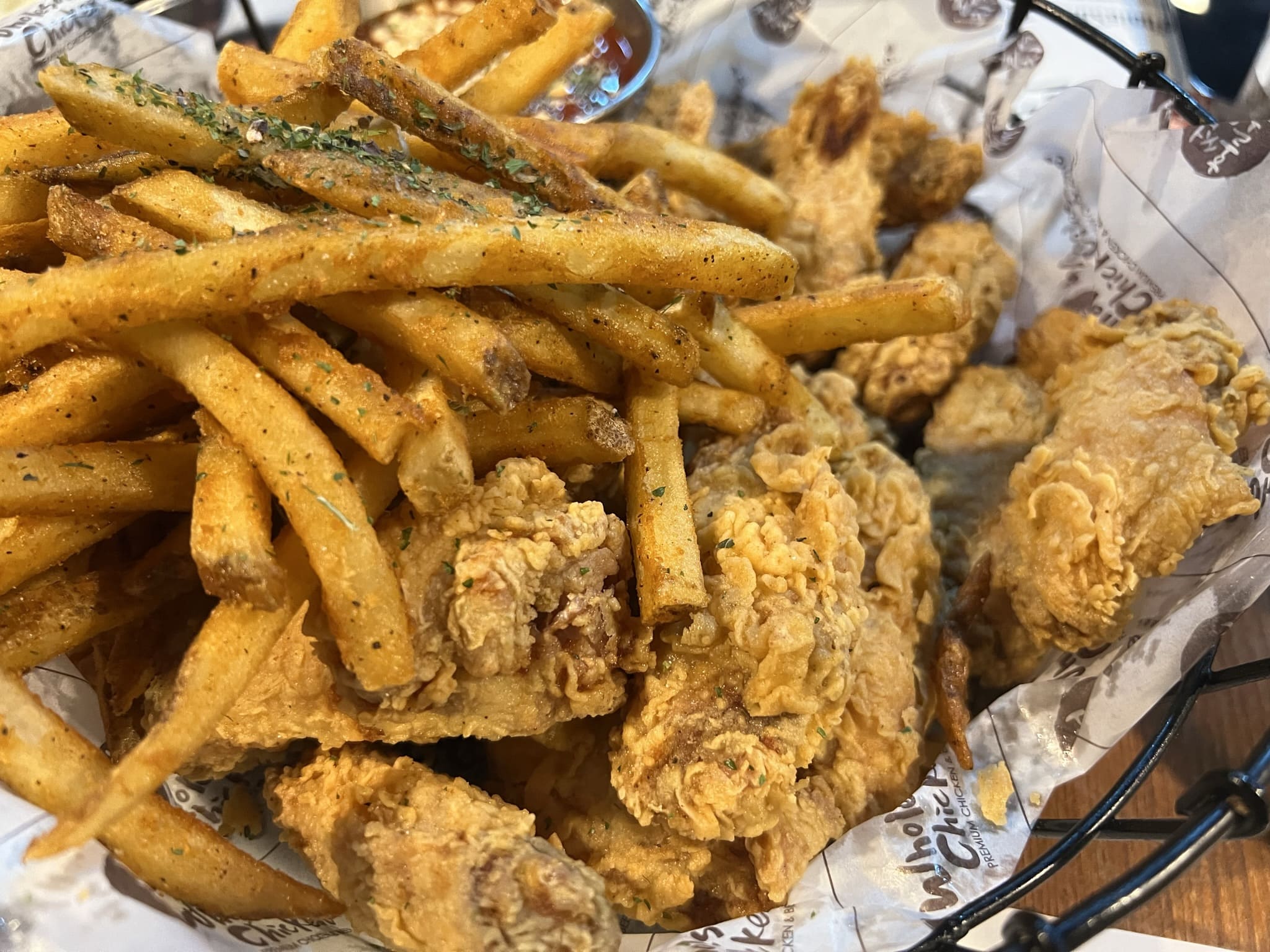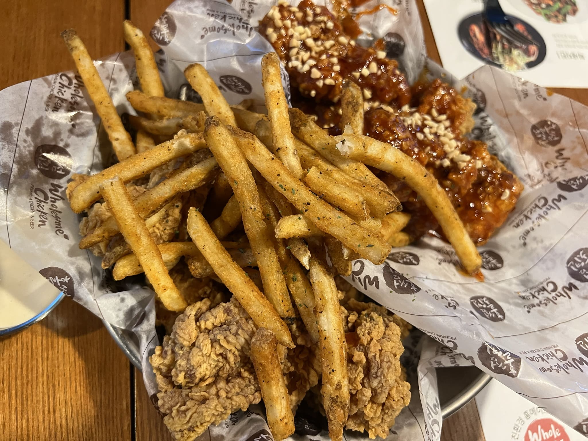마지막으로 나온 메뉴는 소이갈릭입니다. 뜻 그대로 간장마늘치킨인데요. 어렸을때는 양념치킨, 후라이드치킨밖에 없었는데 어느덧 온갖 종류의 소스가 많이 나오더라고요. 물론 나온 지 오래된 양념이긴 하지만 여전히 새로운 맛의 간장마늘소스입니다. 한국인은 역시 마늘의 민족 아니겠습니까? 거기에 간장이니 맛이 없을 수 없죠. 꽈리고추랑 감튀가 같이 올라가져 있네요.