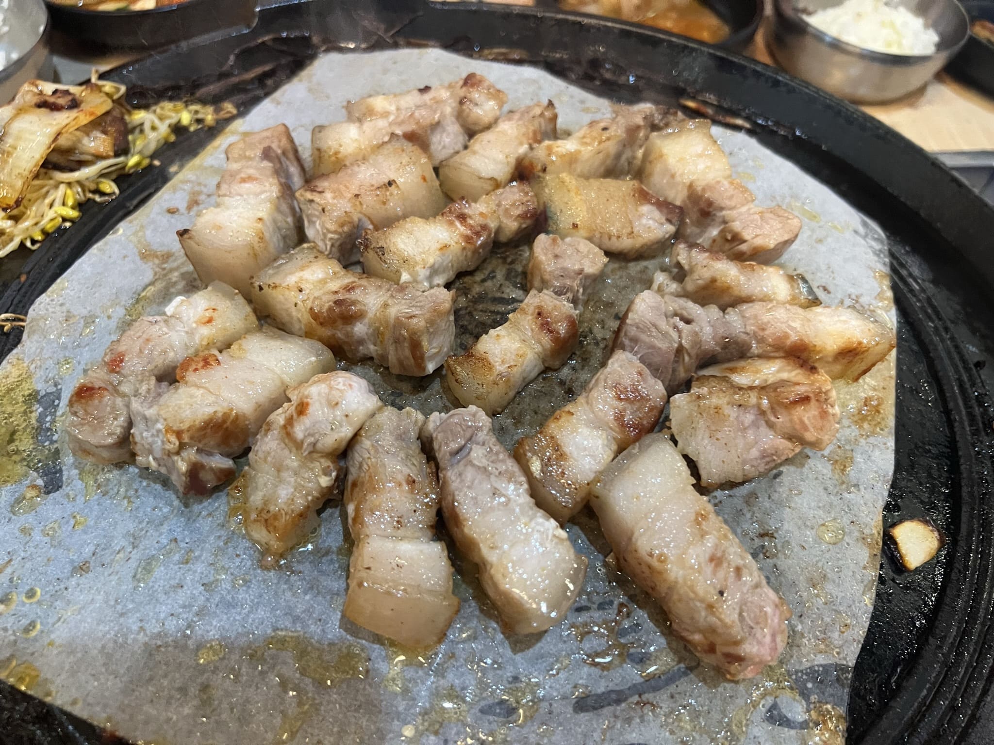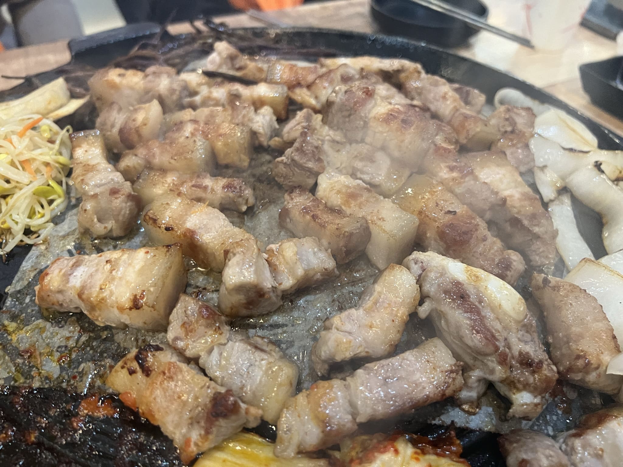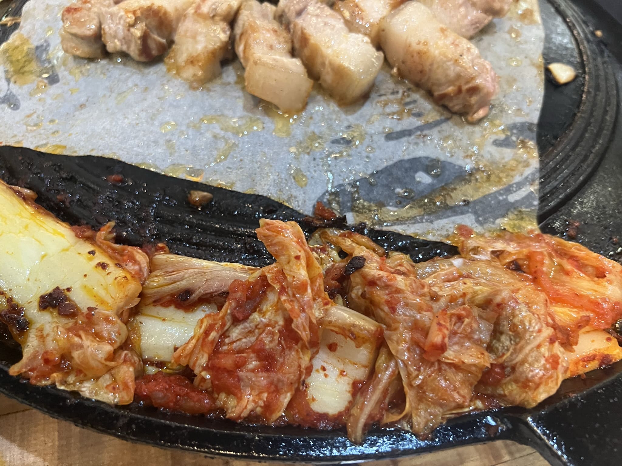 솥뚜껑 삼겹살에 김치와 콩나물은 못 참죠. 정석 of 정석 아닐까요? 김치찜이 맛있는 집이다 보니 김치는 그냥 먹어도 맛있네요. 이걸 솥뚜껑에 굽는다? 지금 생각해도 침이 나오네요.