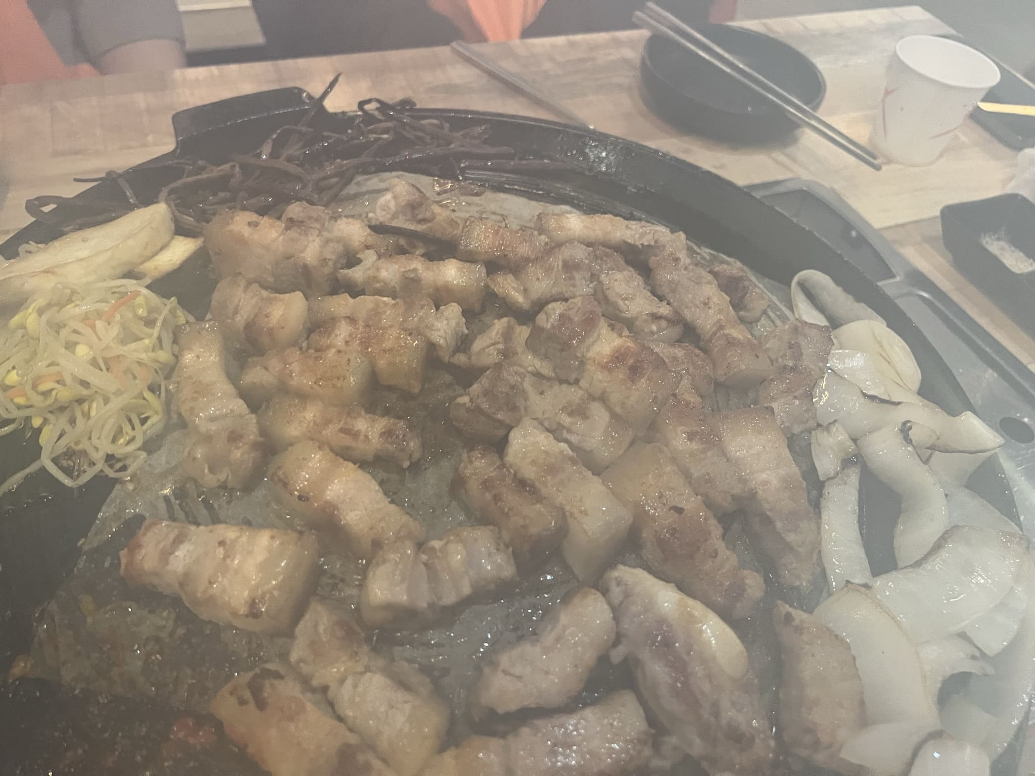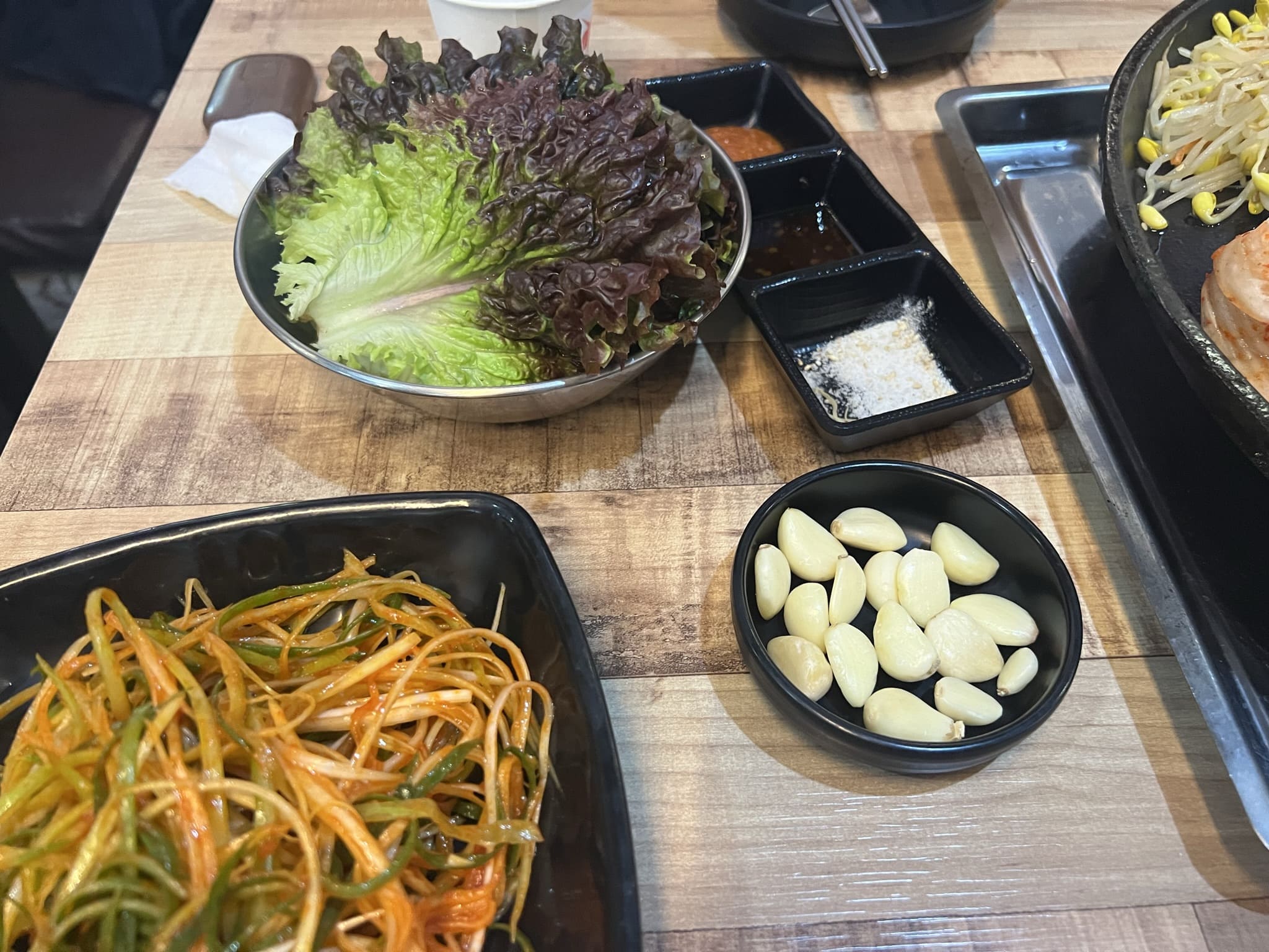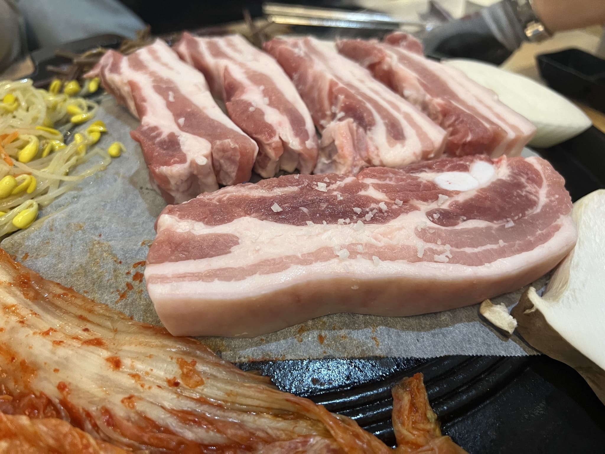 솥뚜껑 삼겹살에 김치와 콩나물은 못 참죠. 정석 of 정석 아닐까요? 김치찜이 맛있는 집이다 보니 김치는 그냥 먹어도 맛있네요. 이걸 솥뚜껑에 굽는다? 지금 생각해도 침이 나오네요.