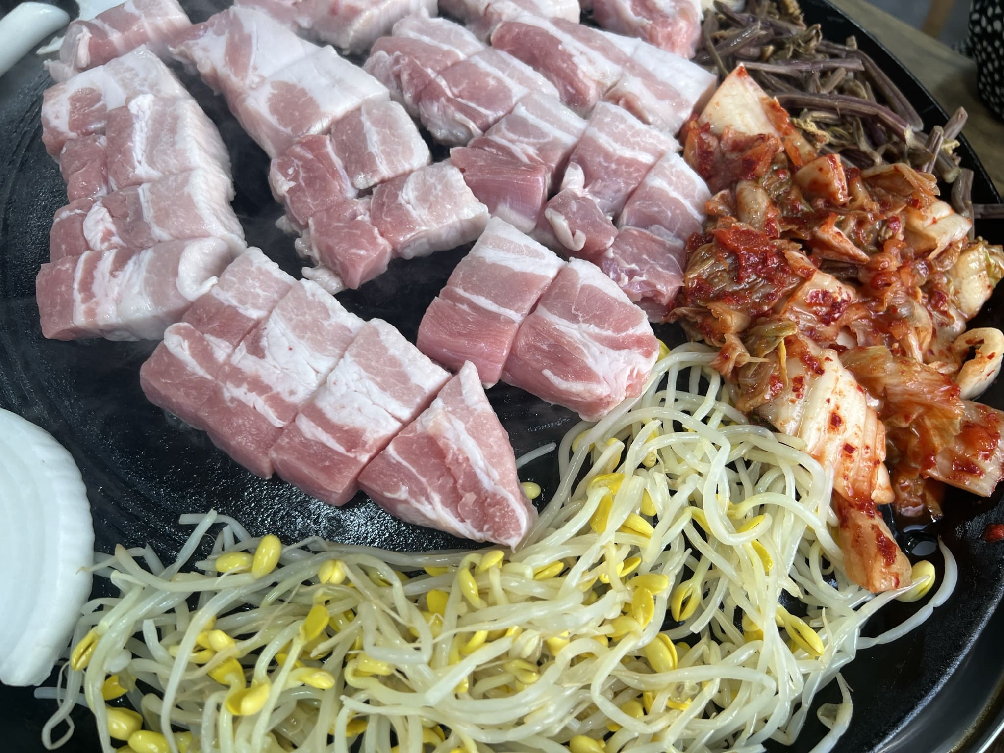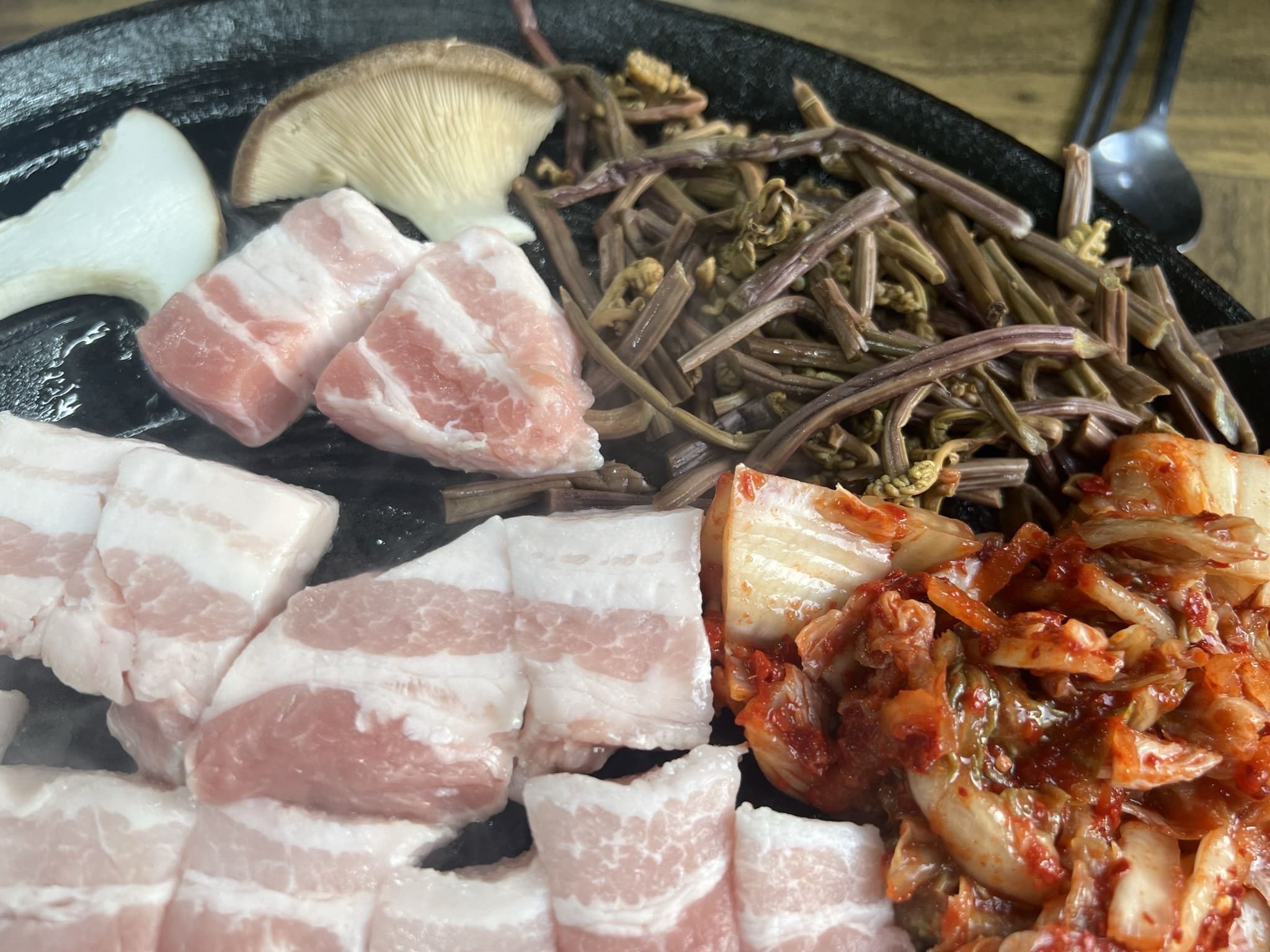 구성 봐주세요. 고기를 중심으로 떡과 버섯, 콩나물과 김치, 양파 거기다 제주도에서 잘 해먹는다는 고사리까지 구성입니다. 고사리를 구워서 고기랑 먹으면 정말 맛있어요. 고사리 표면에 돼지 기름이 칠해져서 고소함이 더해지거든요.