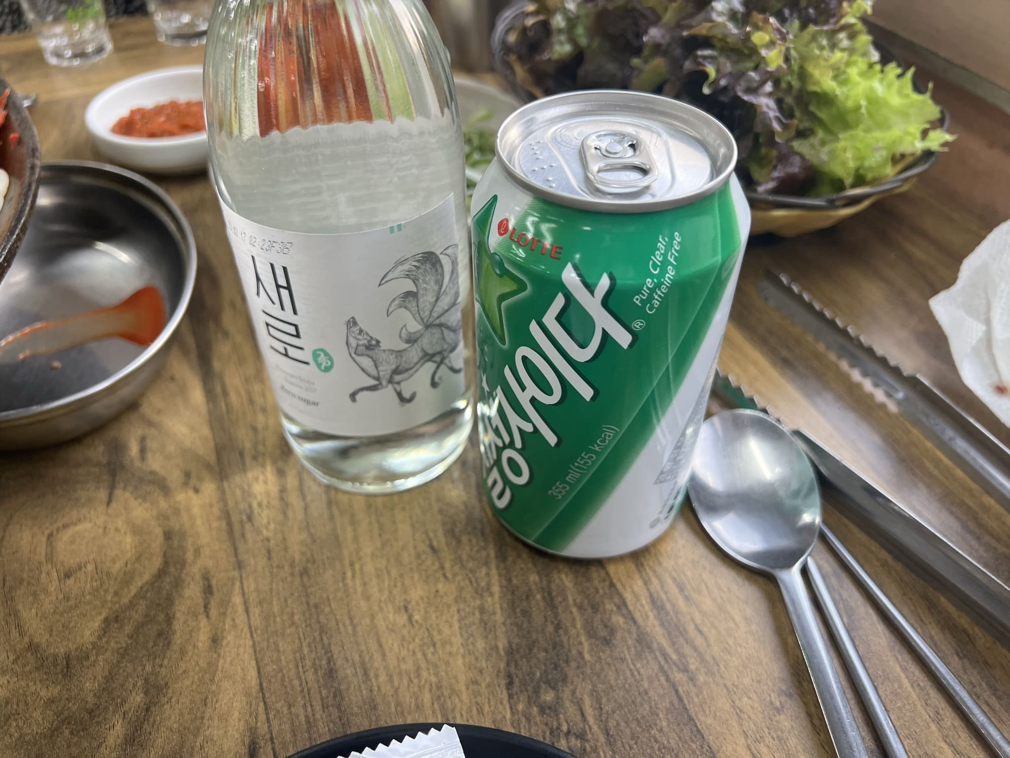 고기와 밥에 된장찌개는 못참죠. 아직도 보글보글 끓고 있는 저 된장찌개, 아주 구수하고 맛있었습니다. 또 이날은 못참고 소주를 시켰습니다. 소개해준 사람이 소주+사이다 조합도 함께 추천해줘서 1:1 비율로 타먹었습니다.