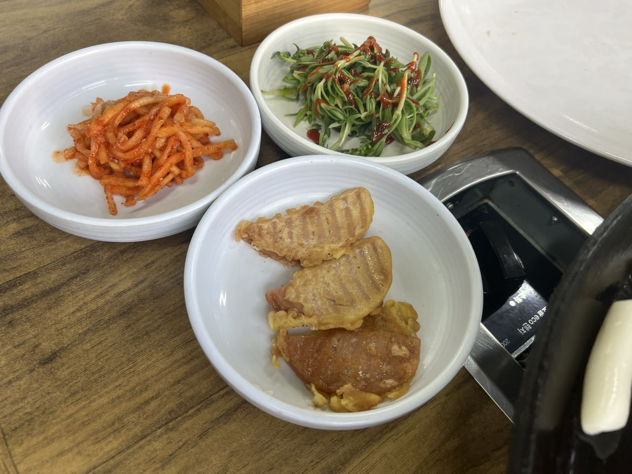 고기 주변의 곁들임들도 지글지글 익어가고 있습니다. 솥뚜껑 구조상 중앙부분에서 멀수록(뚜껑 주변으로 갈 수록) 열전도가 낮습니다. 그래서 고기가 익는 순간과 사이드가 익는 순간이 적절하게 맞게 되는거 같아요.