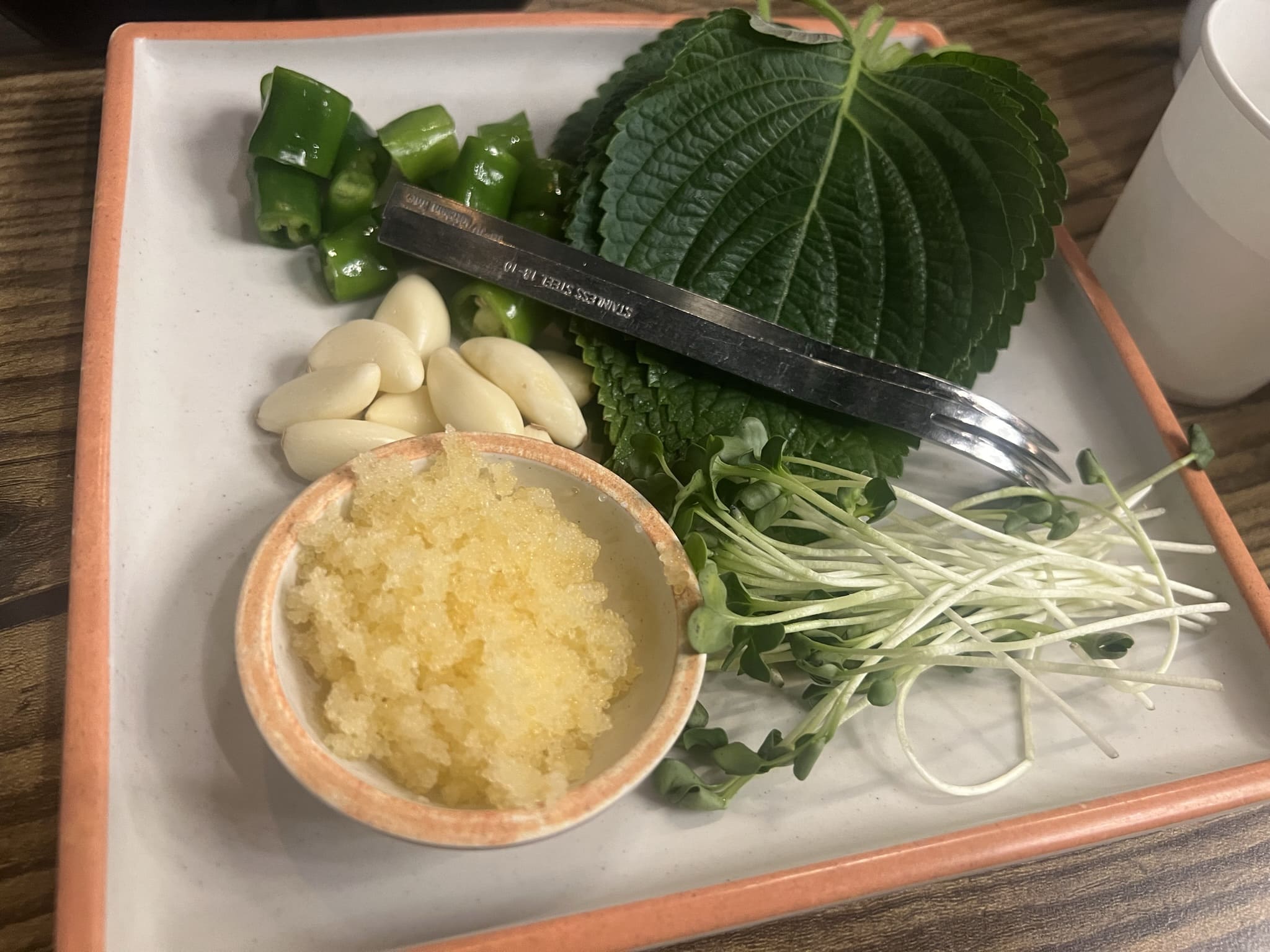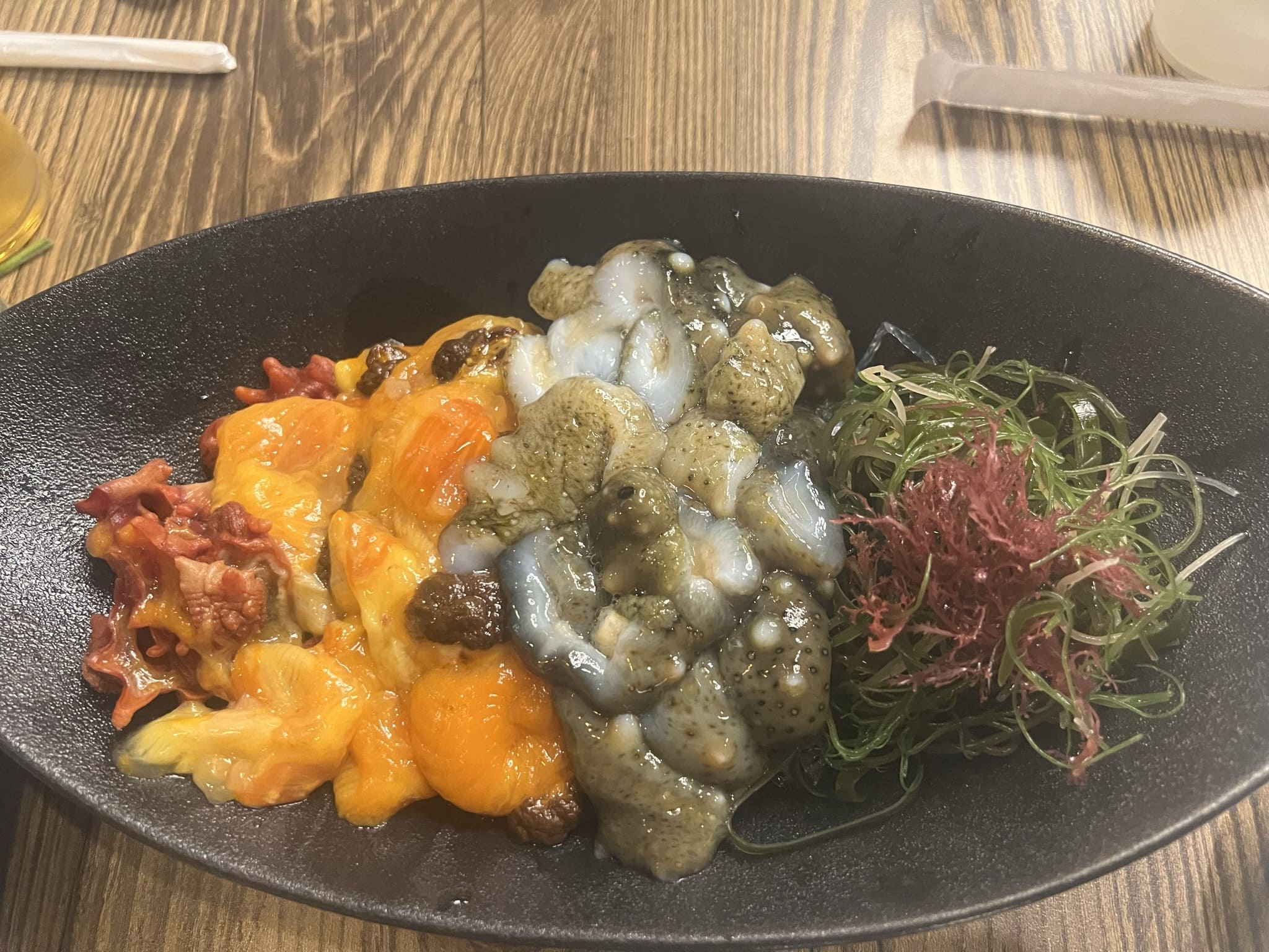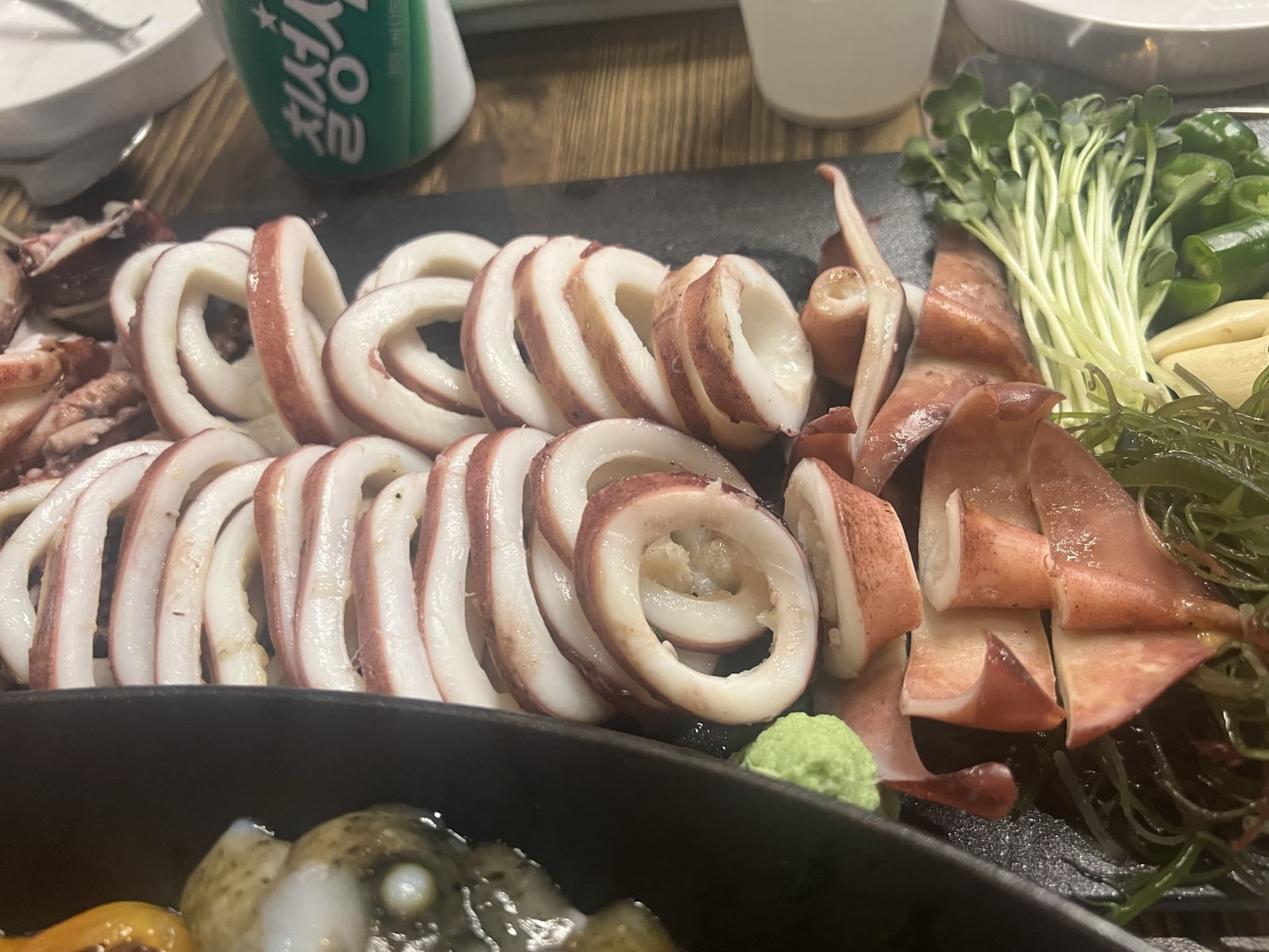 골뱅이와 함께 싸먹을 쌈 구성입니다. 깻잎에 생마늘과 고추, 무싹과 날치알이 있네요. 해삼이나 해초 멍게등 한 접시는 같이 가신분이 단골이셔서 서비스로 받았습니다. 종종 저렇게 주신다고 하시네요. 오독오독 신선하니 꽤나 좋았습니다.