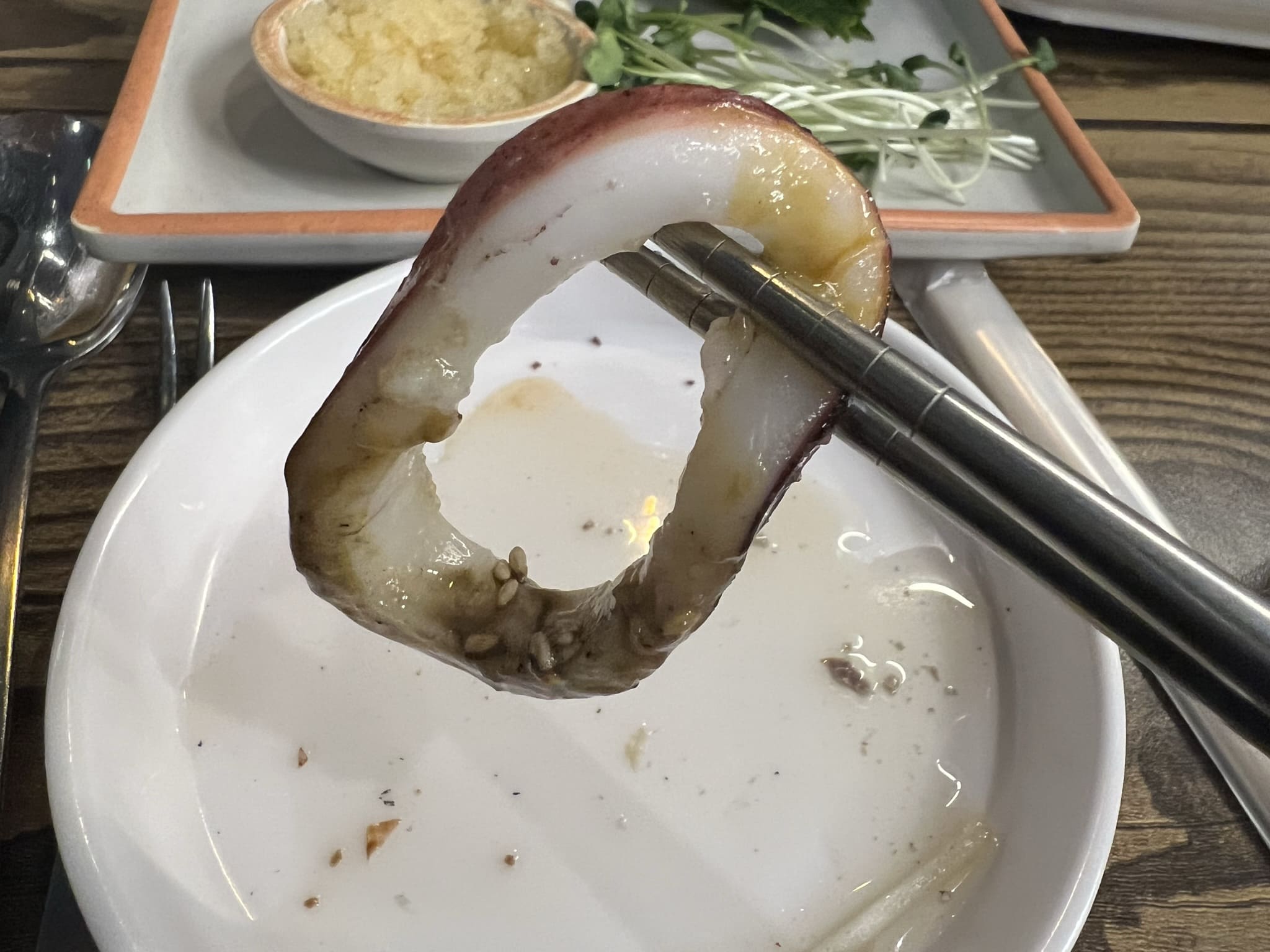 함께 시킨 오징어 통찜입니다. 오징어를 몸통과 다리까지 통으로 쪄낸 음식입니다. 이것도 이 집의 별미라고 하네요. 쫄깃하고 비린내 하나 없이 맛나게 먹었습니다.