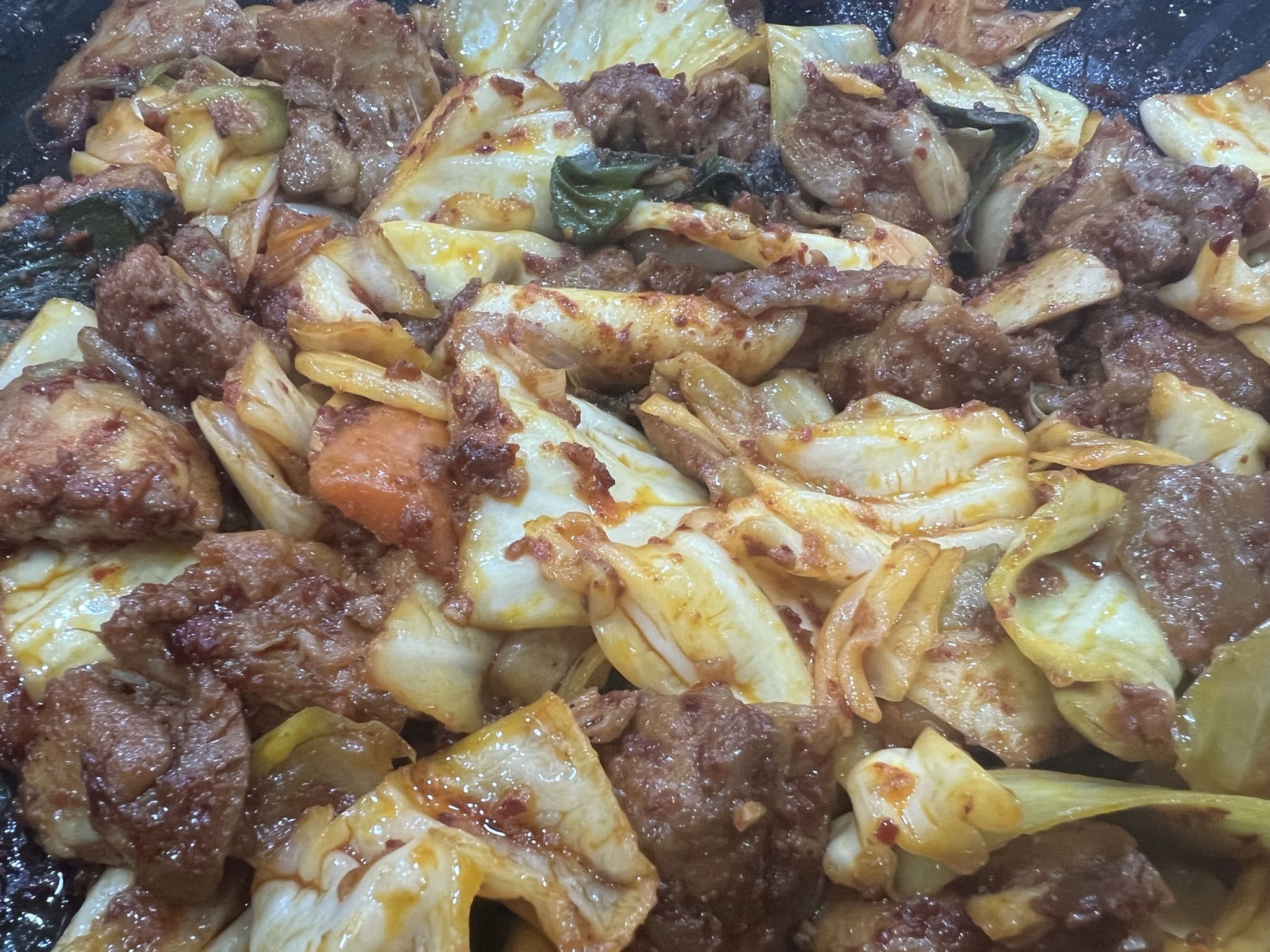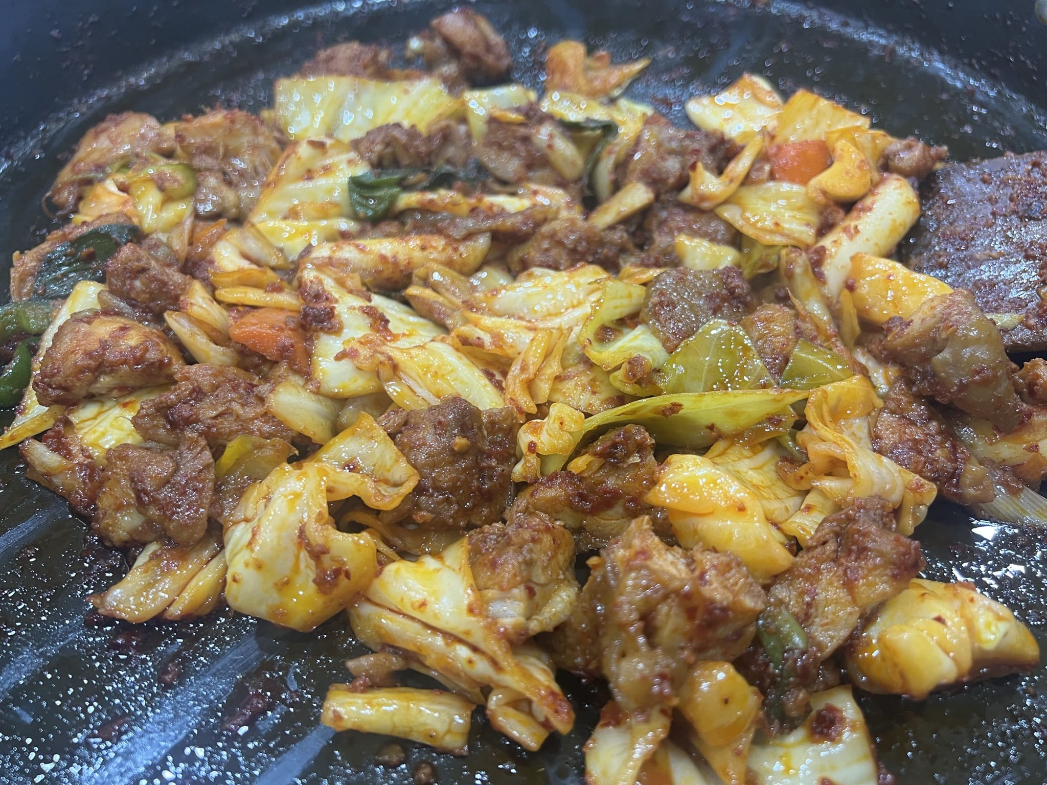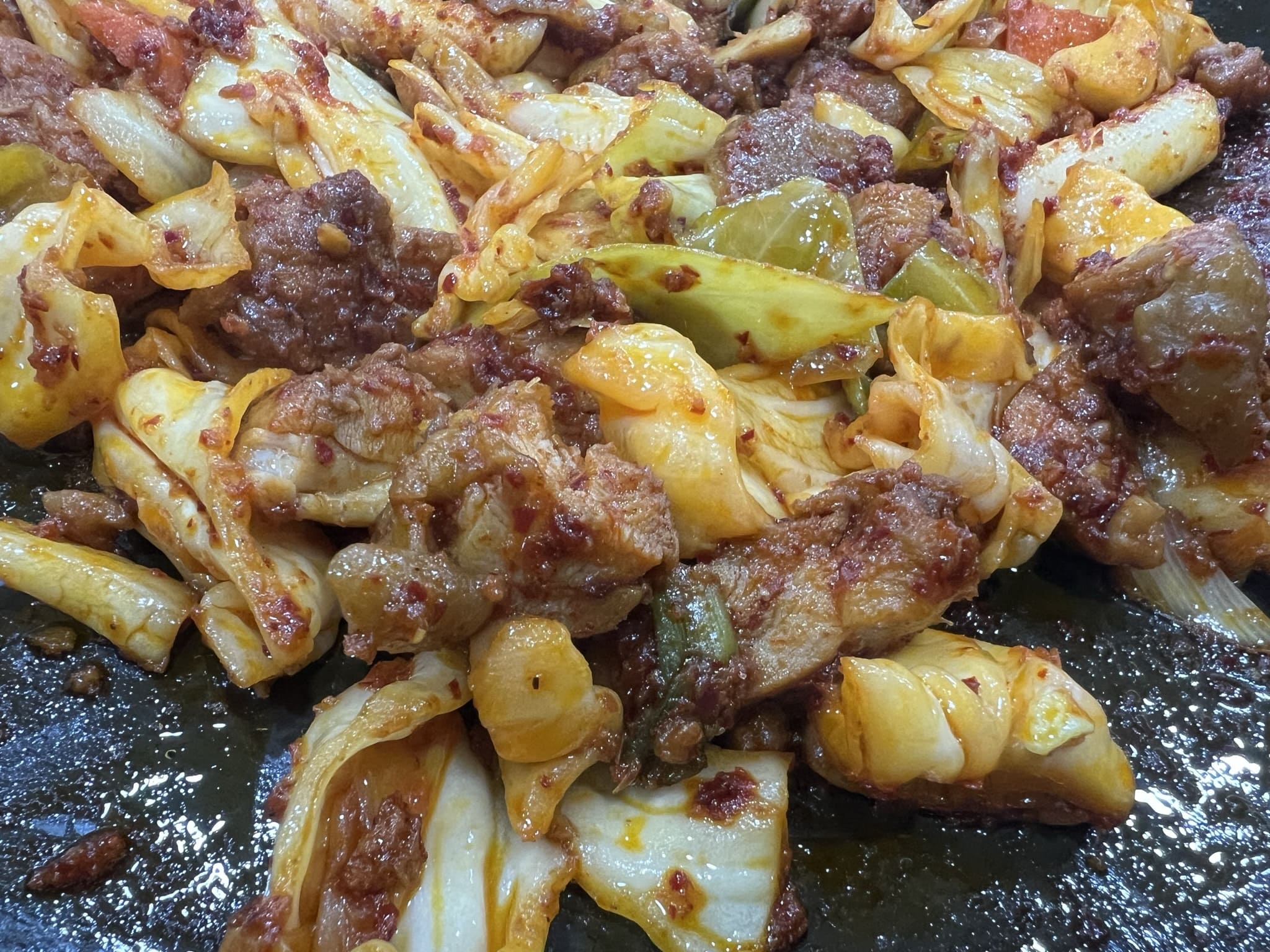 이렇게 보니 조금 빨갛게 보이네요. 닭갈비는 고기만 먹어도 좋기는 하지만, 채소나 떡 같은 사리들과 함께 먹으면 아주 조화롭고 좋네요.