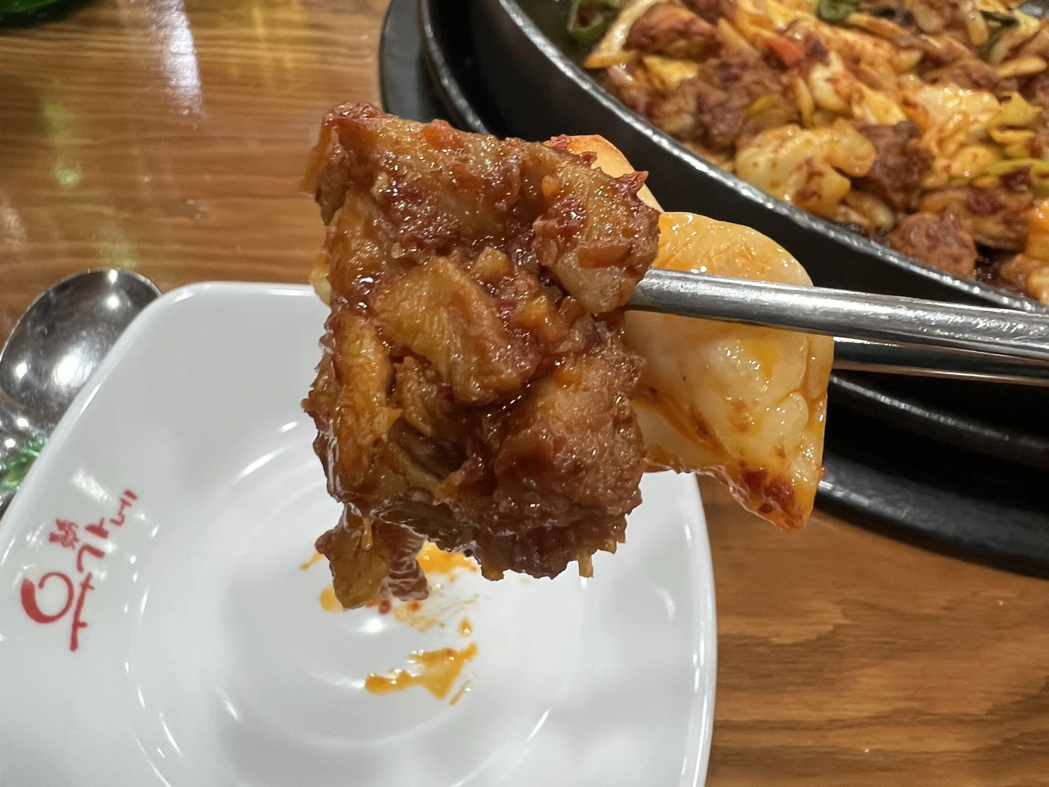 이렇게 보니 조금 빨갛게 보이네요. 닭갈비는 고기만 먹어도 좋기는 하지만, 채소나 떡 같은 사리들과 함께 먹으면 아주 조화롭고 좋네요.