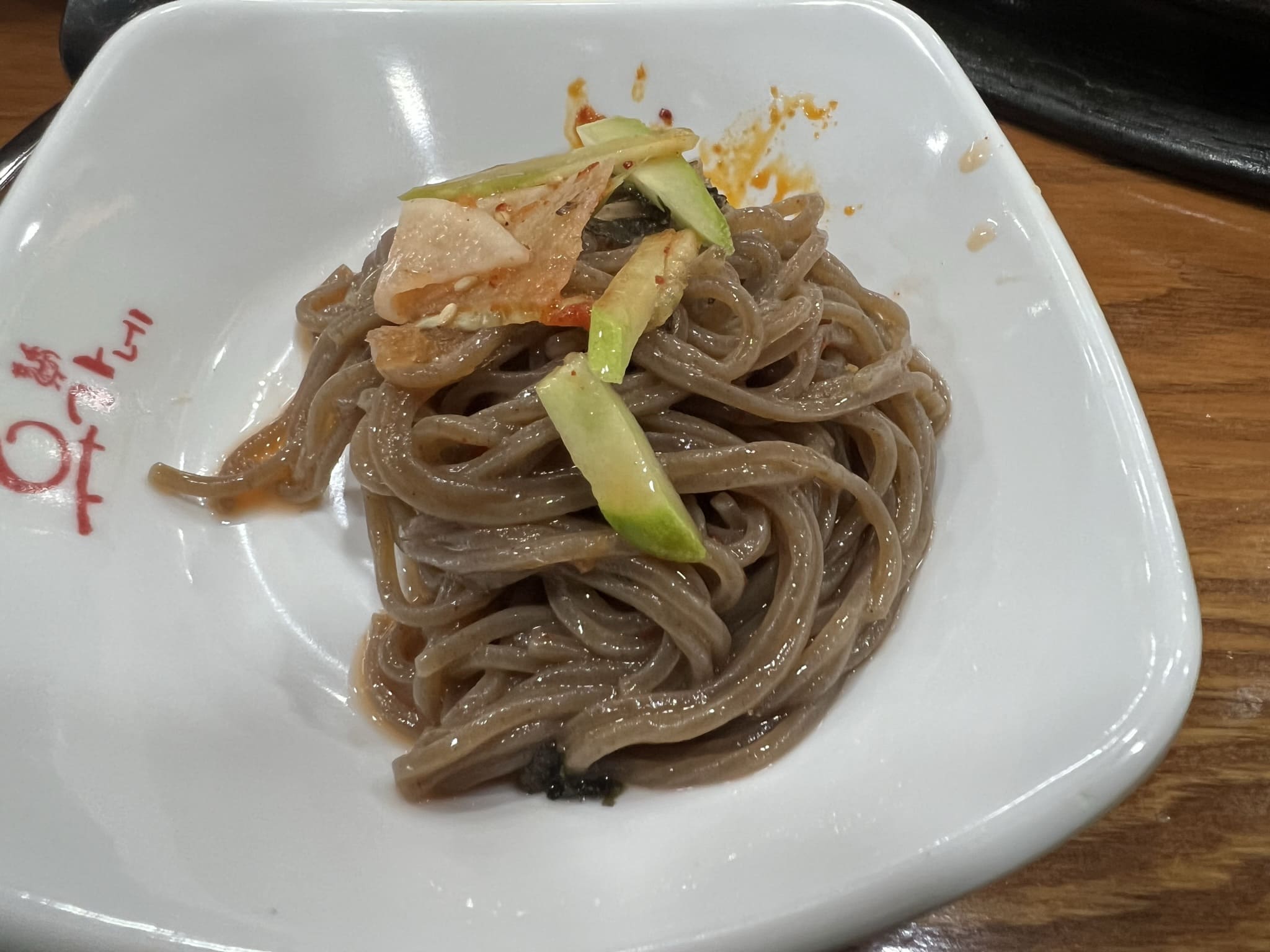 막국수를 시켰으니 닭갈비와 함께 먹어주는게 국룰 이죠. 촥 감기는 막국수의 면발을 뒤로 닭갈비의 탱글 매콤한 직화향이 어우러져 듬직한 한입이었습니다.