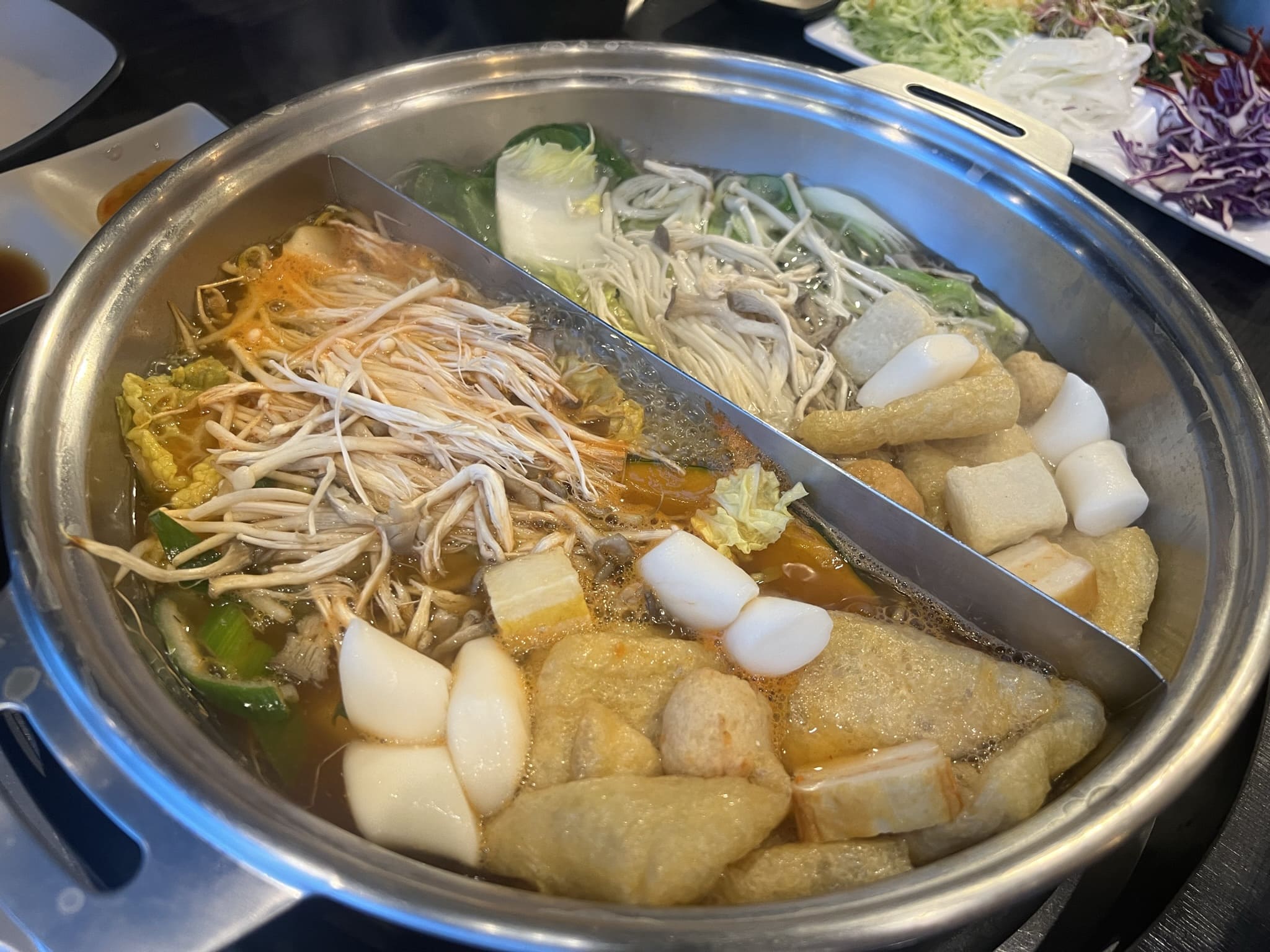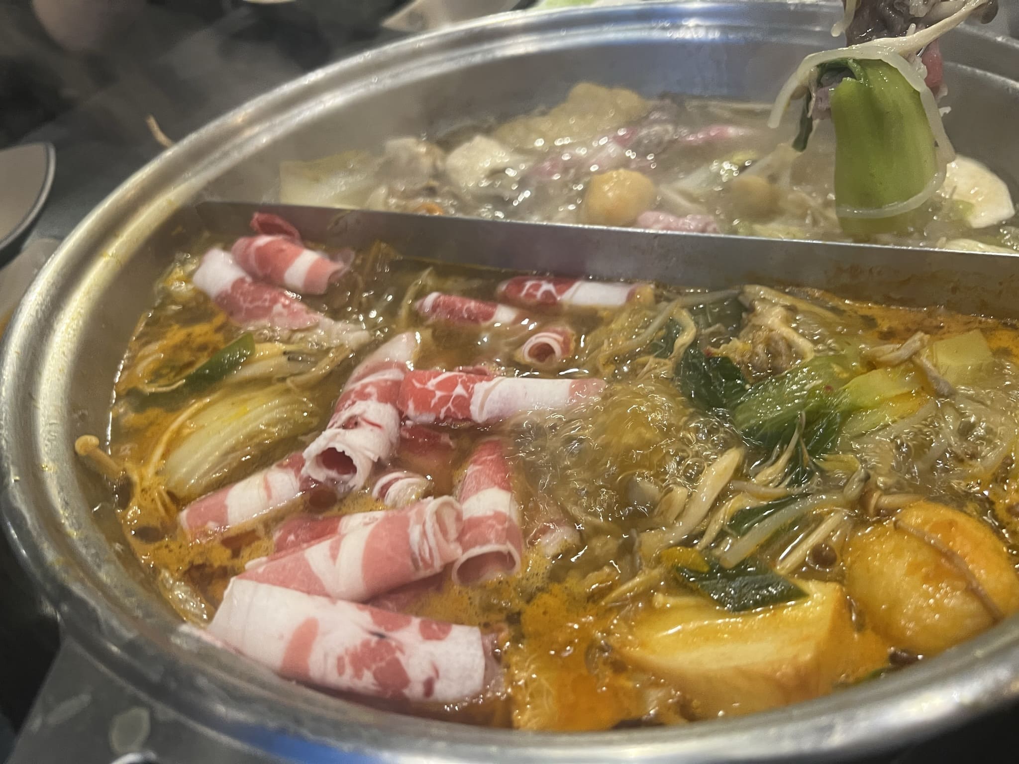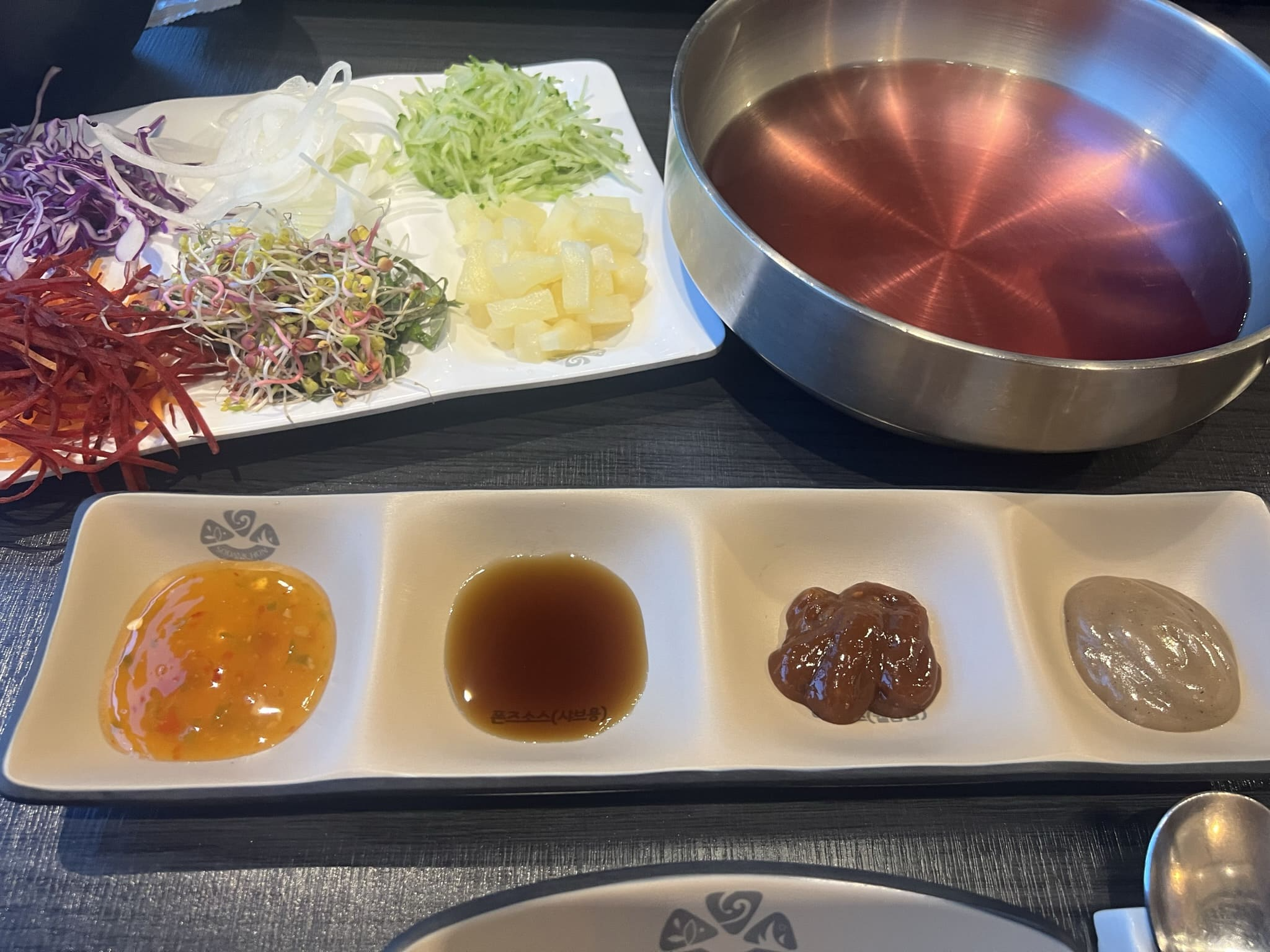 나온 고기들을 육수에 넣고 익혀 줍니다. 보글보글 끓고 있는 자태가 너무나도 아름답습니다. 육수의 풍미를 더해주기 위하여 채소들과 육수맛을 내줄 식재료들을 셀프바에서 가져와 함께 끓이고 있습니다.