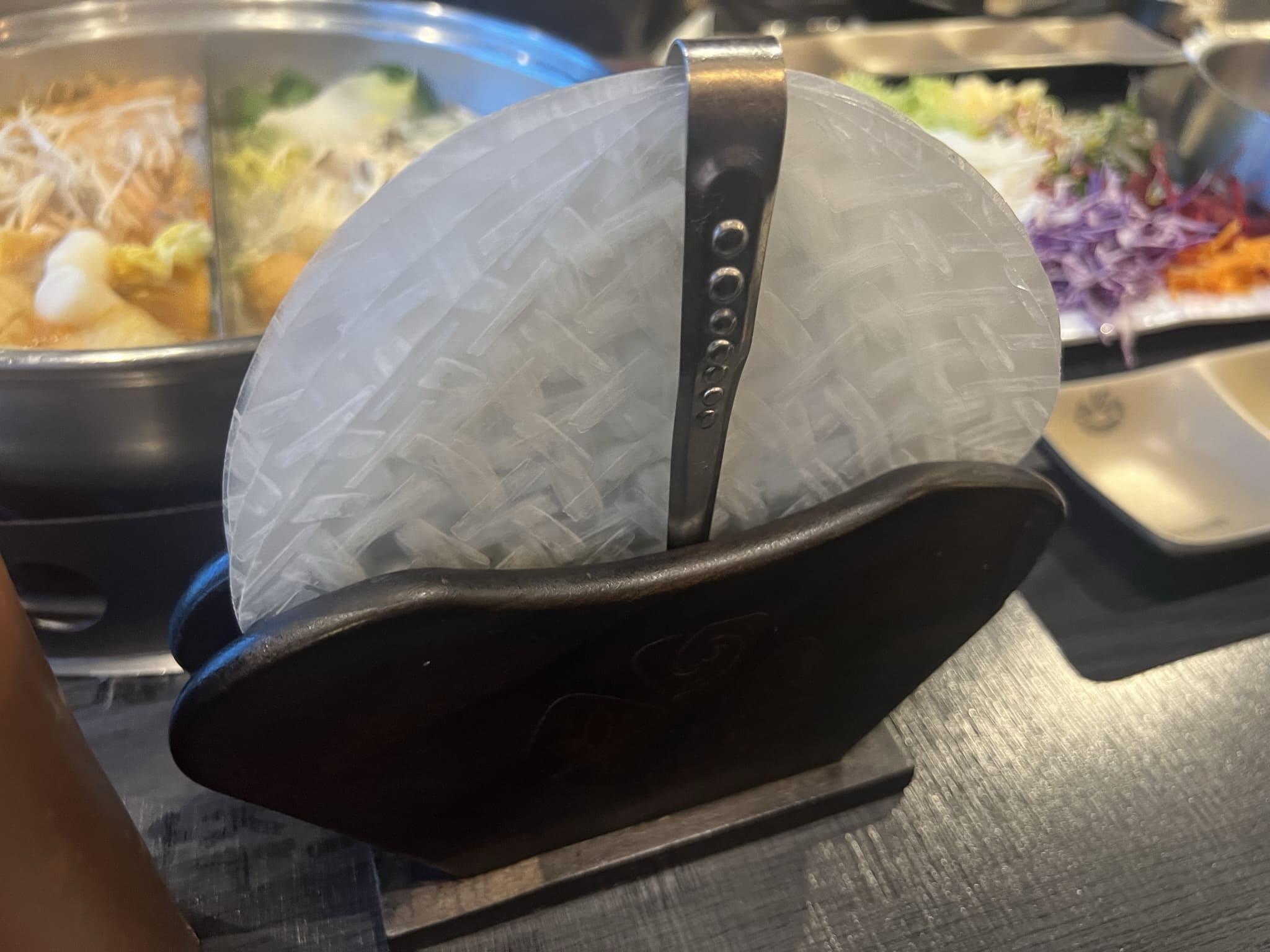 월남쌈을 쌈이라 불리게 해주는 라이스페이퍼입니다. 이것 또한 모자라면 리필을 해주니, 적절하게 드시면 됩니다. 라이스페이퍼를 데쳐먹을 수 있는 뜨거운 육수(?)를 함께 줍니다 해당 육수가 식었다 싶으면 리필을 받으시는 걸 추천합니다. 나중 가서 너무 식으면 쌈이 잘 풀어지지 않아요.