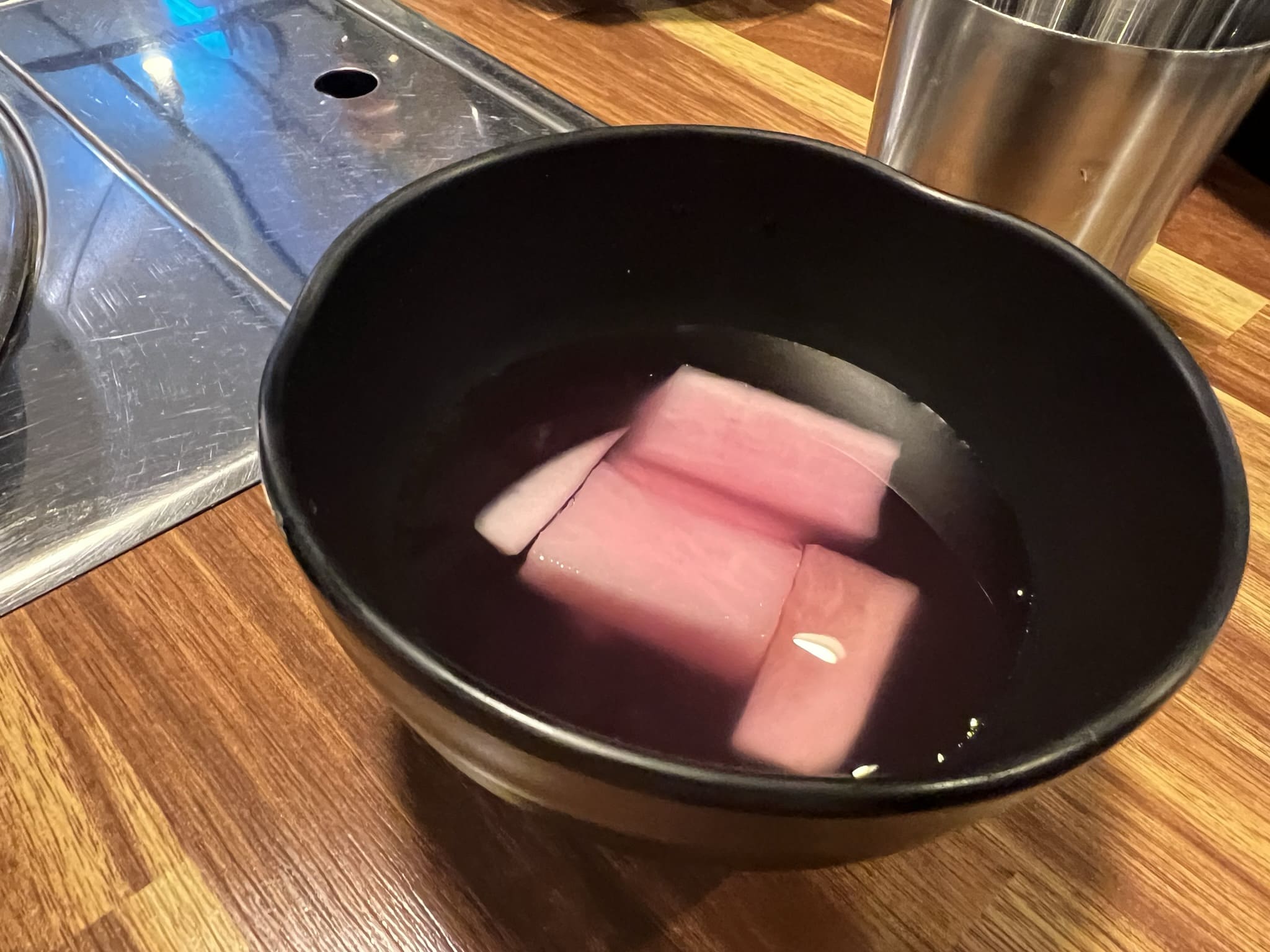 기본으로 주는 붉은 무 동치미입니다. 매운 음식을 먹을 때는 동치미 같은 시원한 반찬이 매운맛을 중화시켜주기도 하고 입가심을 잘해주는 거 같아요.