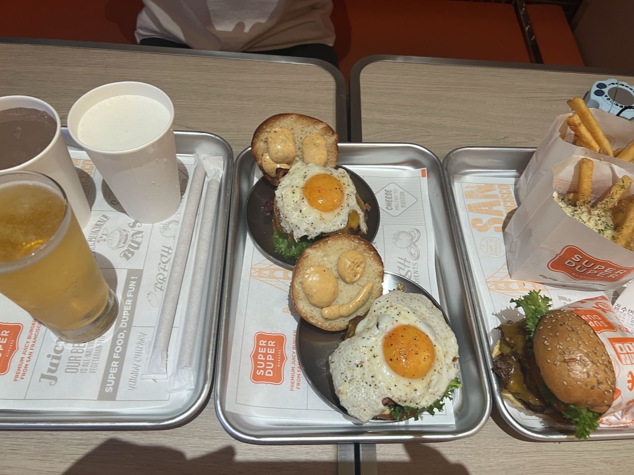 패티가 더블로 들어가는 슈퍼두퍼 더블, 마스코트 스마일과 선라이즈 후라이가 인상적인 베이컨 에그버거를 시켰습니다. 거기에 사이드로 갈릭 프라이즈와 프렌치프라이를 주문했습니다.