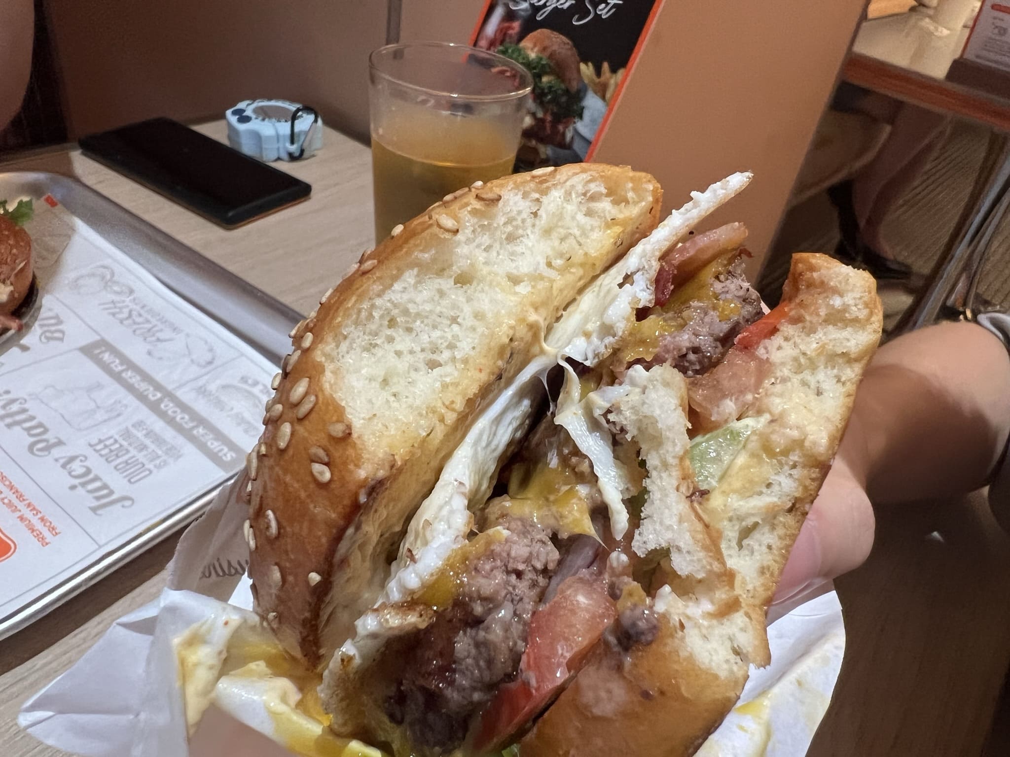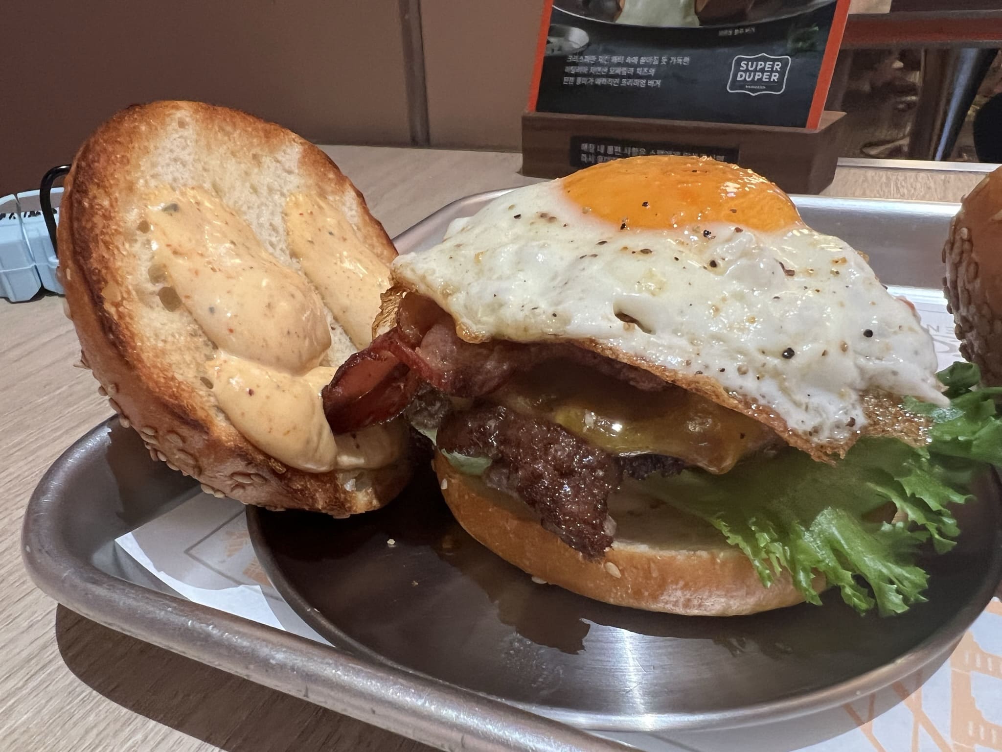 슈퍼두퍼의 패티에 베이컨과 반숙 계란(선라이즈 프라이)이 올라간 인기 메뉴입니다. 위쪽 번에 소스로 마스코트를 그려준 것도 인상적이네요. 이 버거는 캐릭터가 그려진 번을 덮어서 먹어야 하는데 손으로 들고 먹기에는 힘들었습니다. 우선 계란 노른자와 육즙이 많이 흘러나와 손에 너무 묻어 야만적으로 섭취하는 모습을 볼 수 있습니다. 오히려 그게 더 좋고 맛있어 보이는 분들도 계시겠죠?