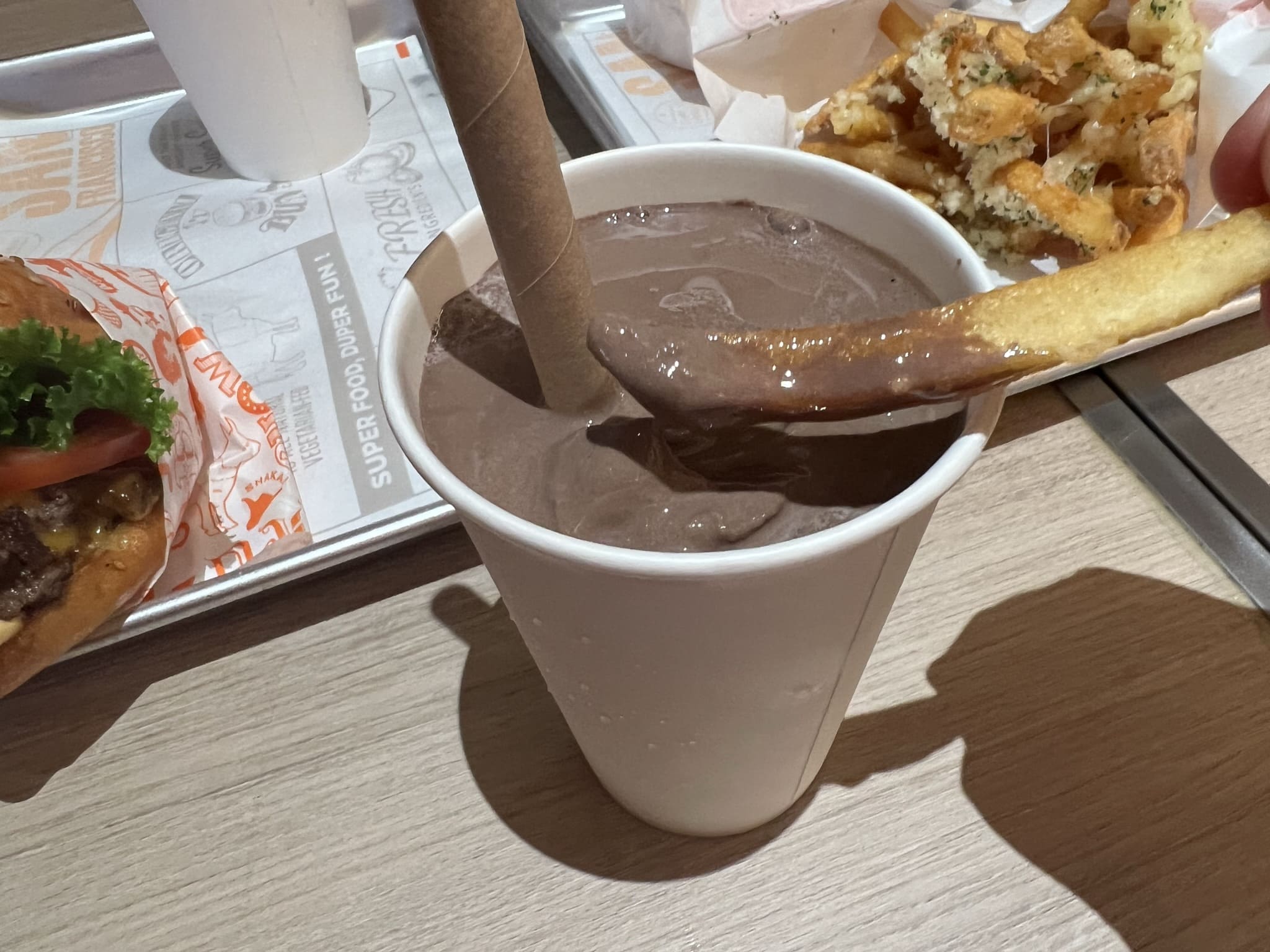 이렇게 쉐이크에 찍어 먹는 게 별미라죠? 살찌는 맛에 살찌는 맛을 합쳤다니 이건 두배로 맛있다는 뜻이 아닐까 싶어요. 실제로 케찹에 찍어 먹는 것과는 다르게 달달하면서 부드러운 크리미함이 느껴지는 별미였습니다.
